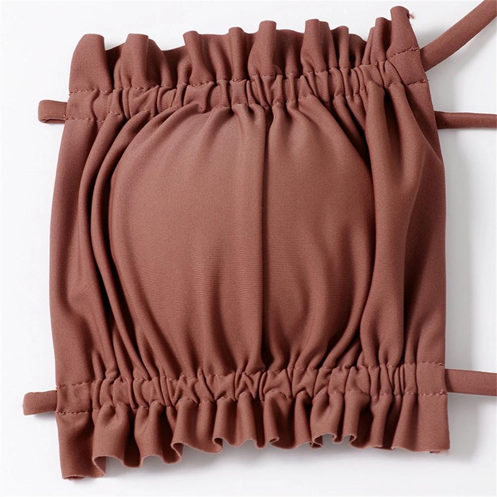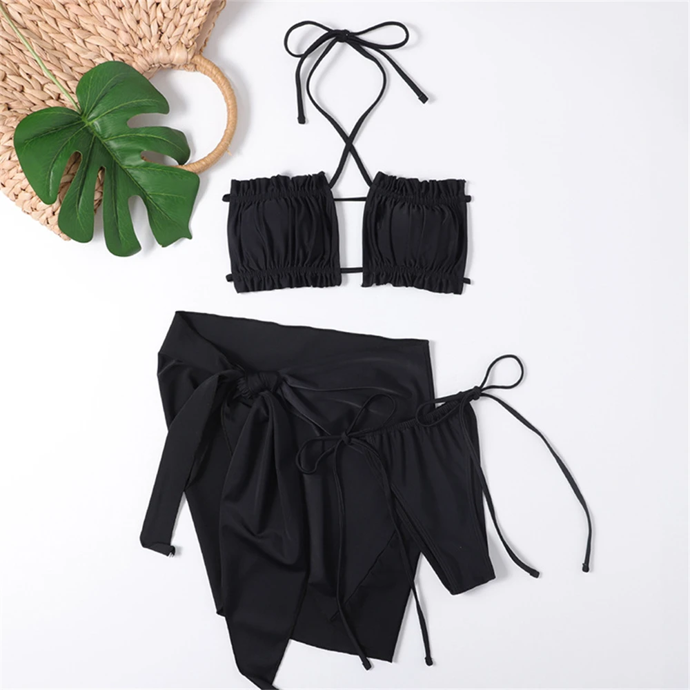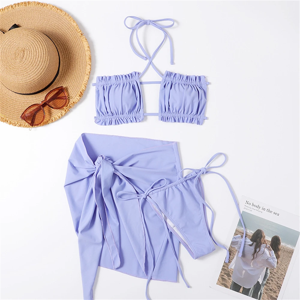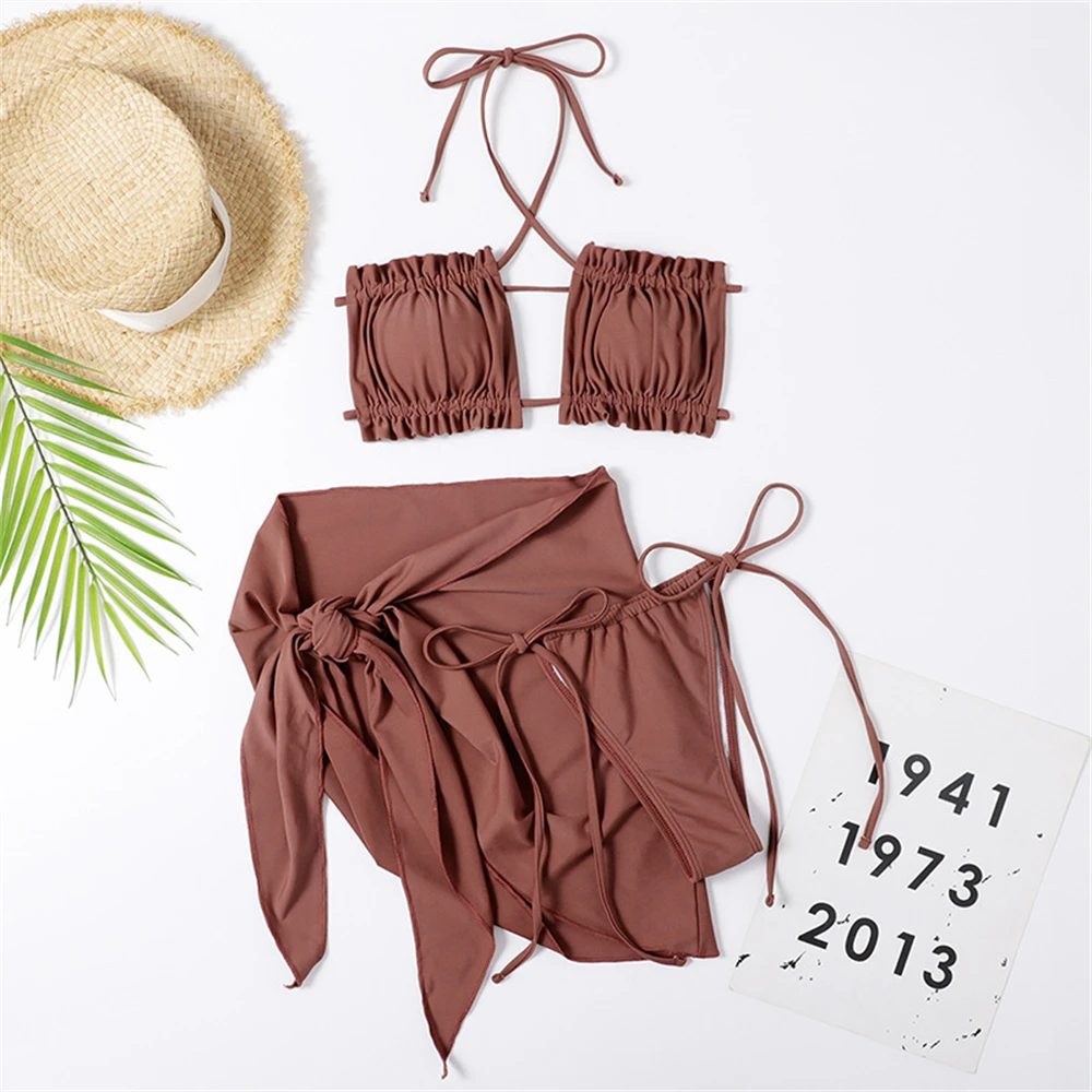Сексуальный однотонный купальник Vigorashely, женское Плиссированное бикини, костюм-тройка, 2021, накидка с узлом, юбка, купальник, купальный костюм с высоким вырезом