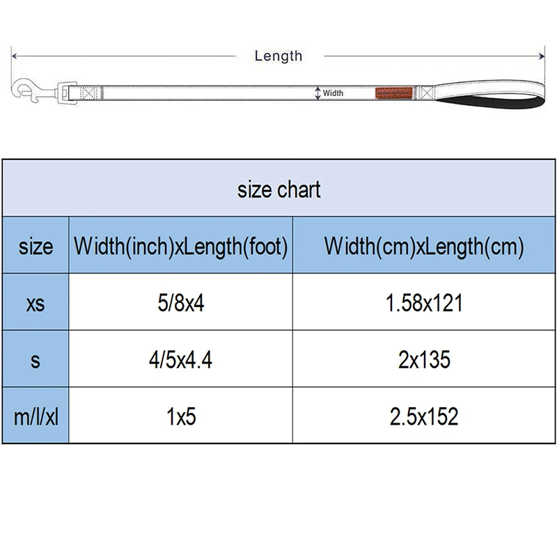 Размеры поводка:XS = 1/2 "x 4 футаS = 3/4 "x 4 футаM = 1 "x 5 футовL = 1 "x 5 футовXL = 1 "x 5 футов