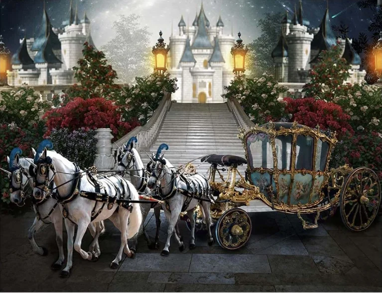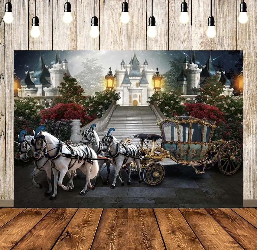Фон для фотосъемки с изображением кареты Золушки, голубого замка, ночного замка, лошади, лестницы