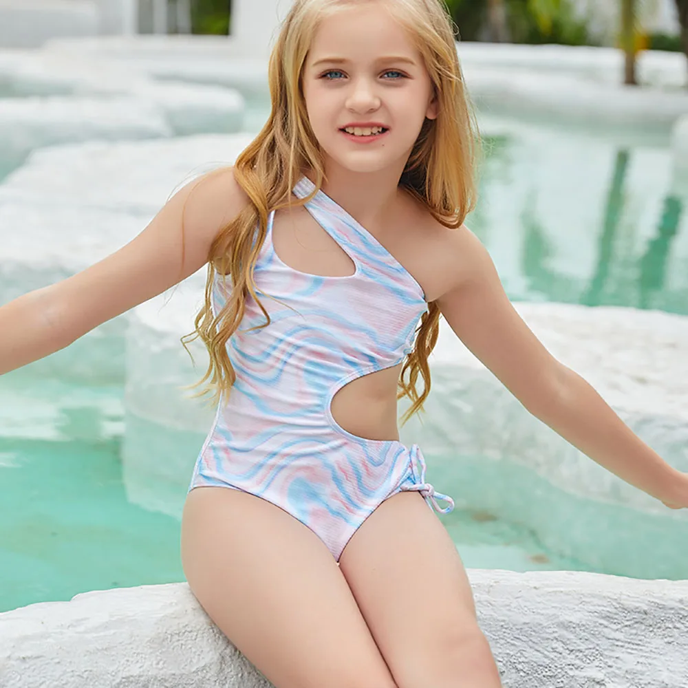 Детский слитный купальник, купальник с рисунком в рубчик, летний купальный костюм с вырезами, боди на одно плечо
