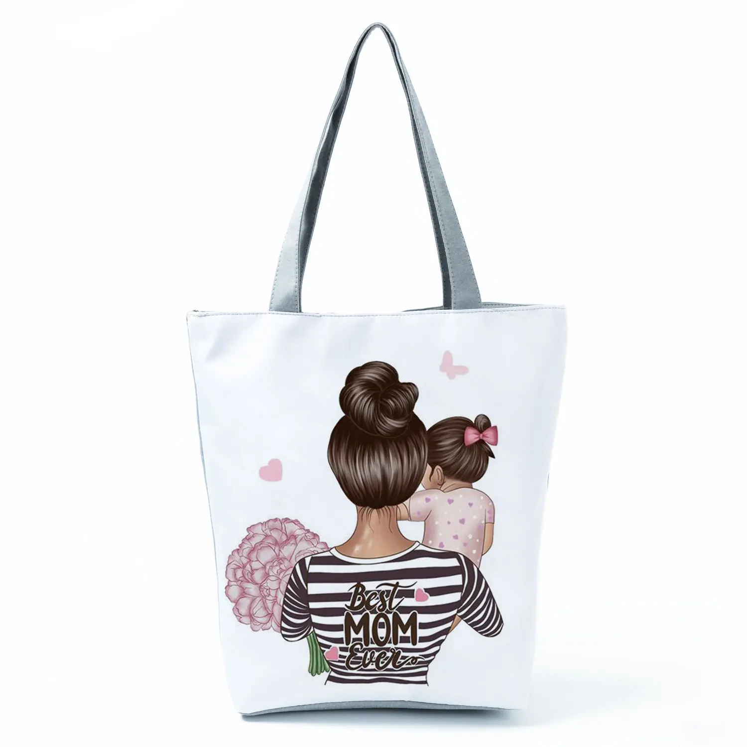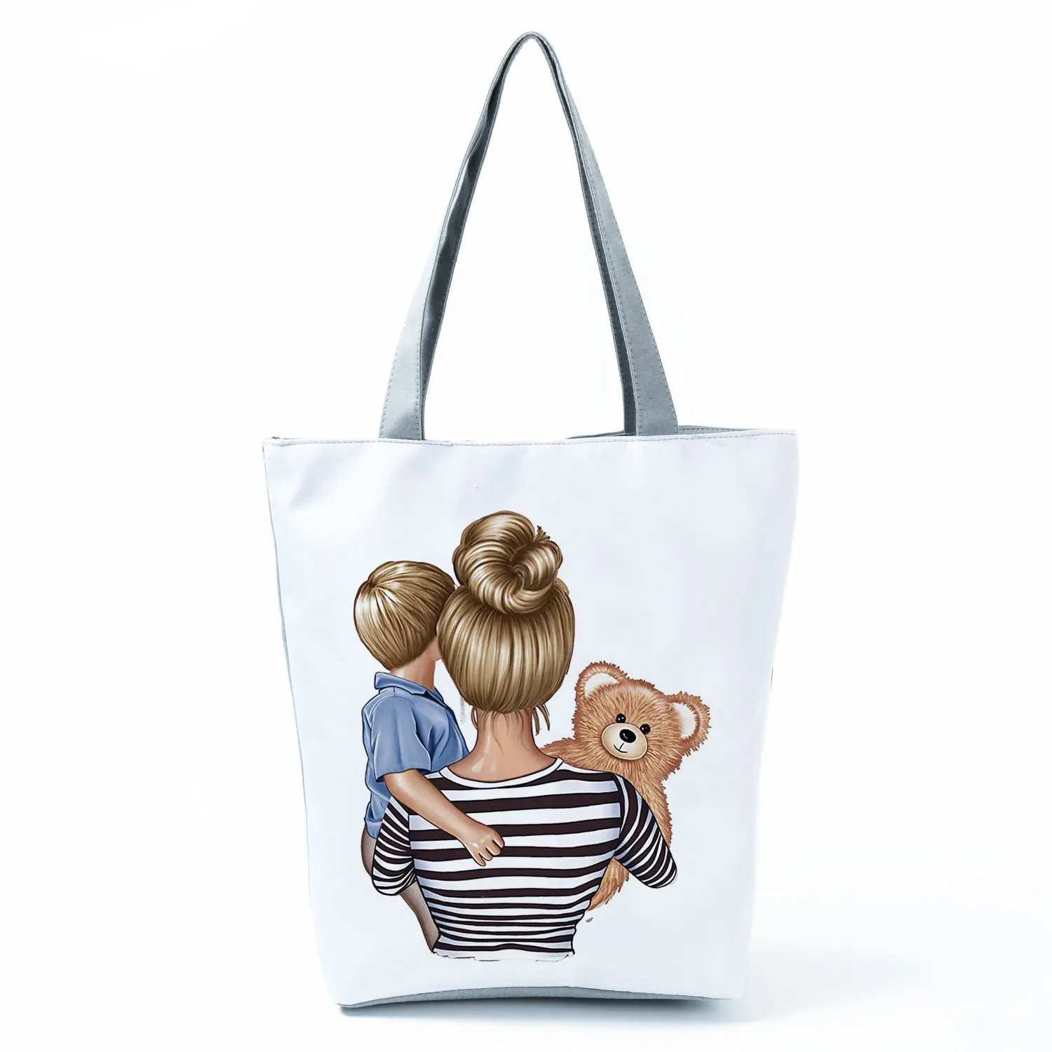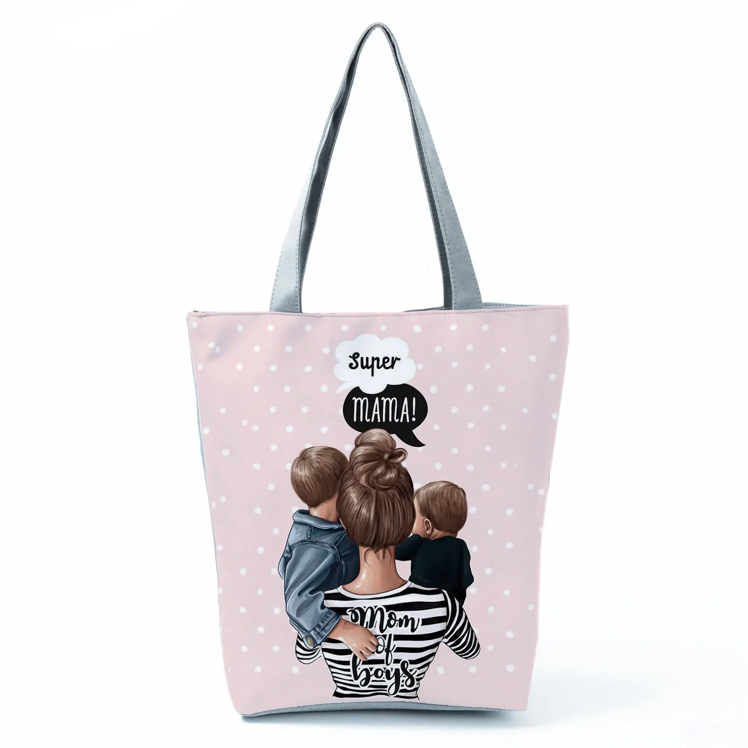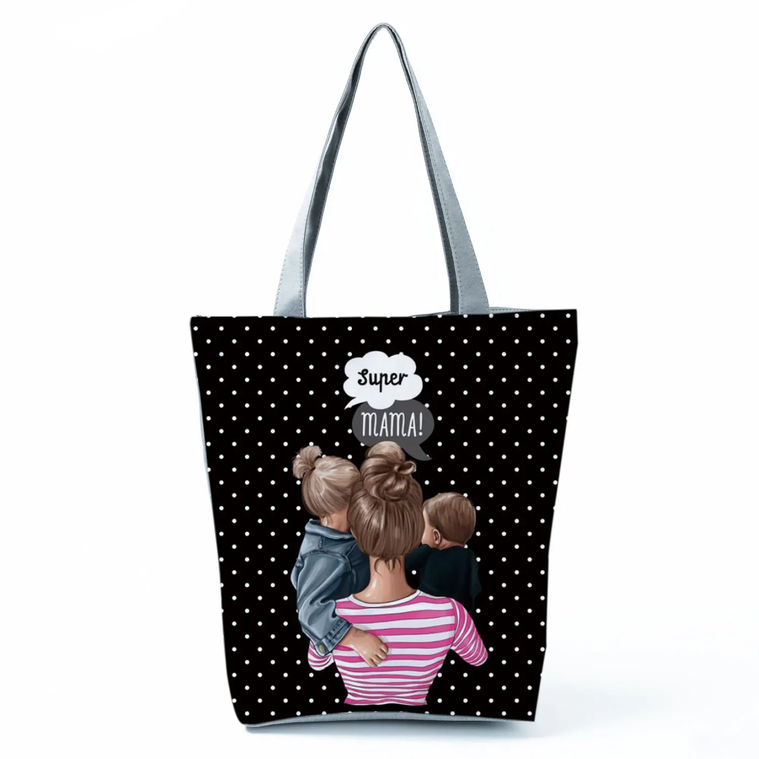 Симпатичные льняные сумки-тоуты с мультипликационным принтом Super Mama, многоразовая сумка через плечо, складные Женские повседневные сумки для мамы и ребенка, женские тканевые сумки-тоуты