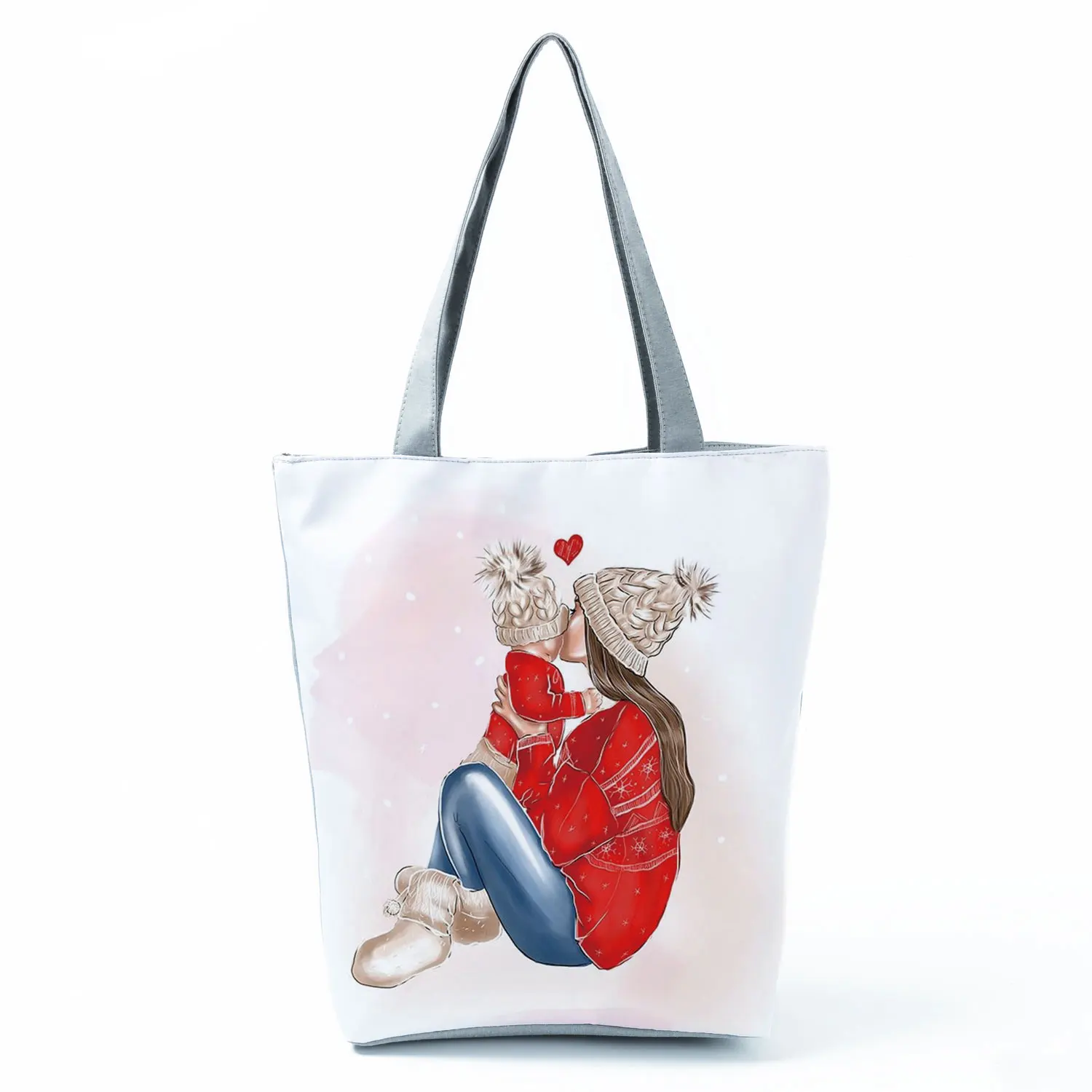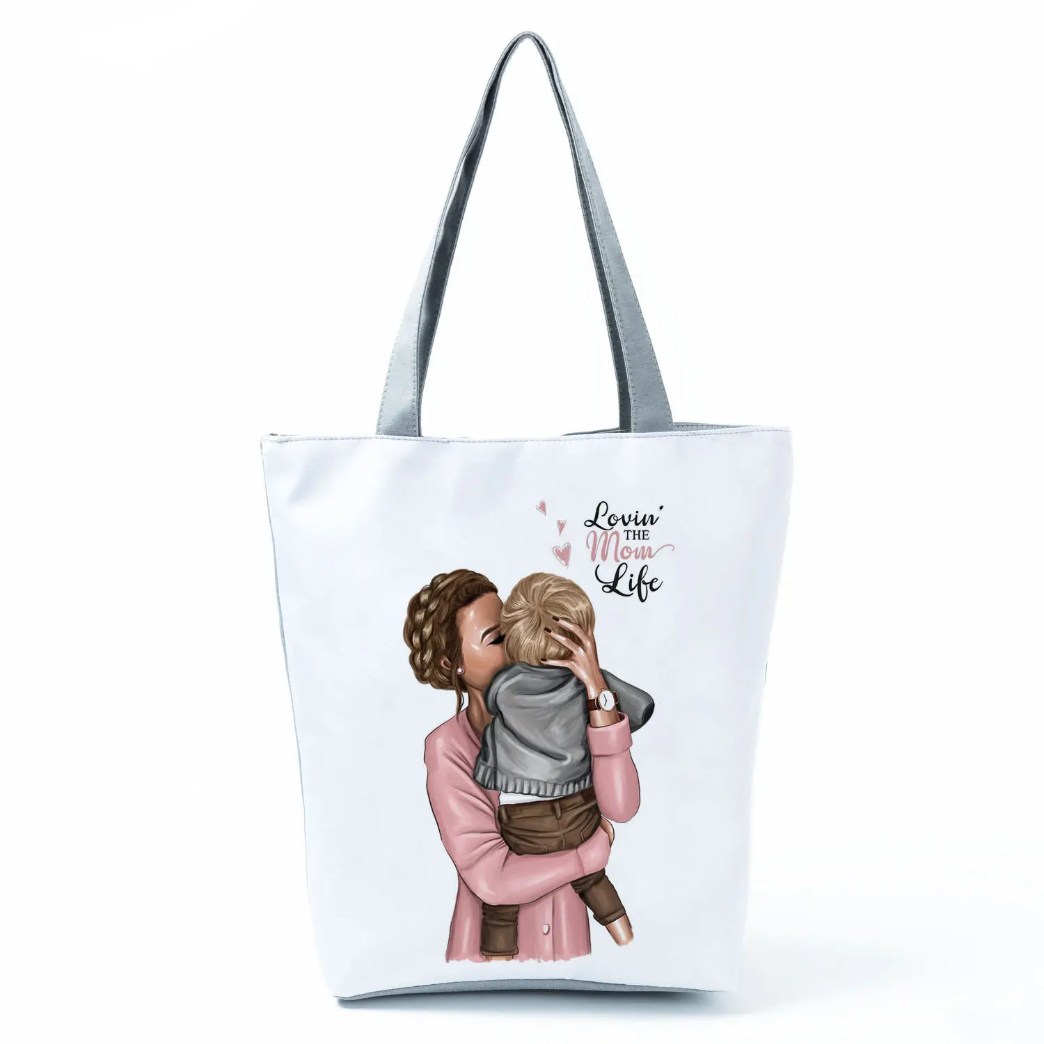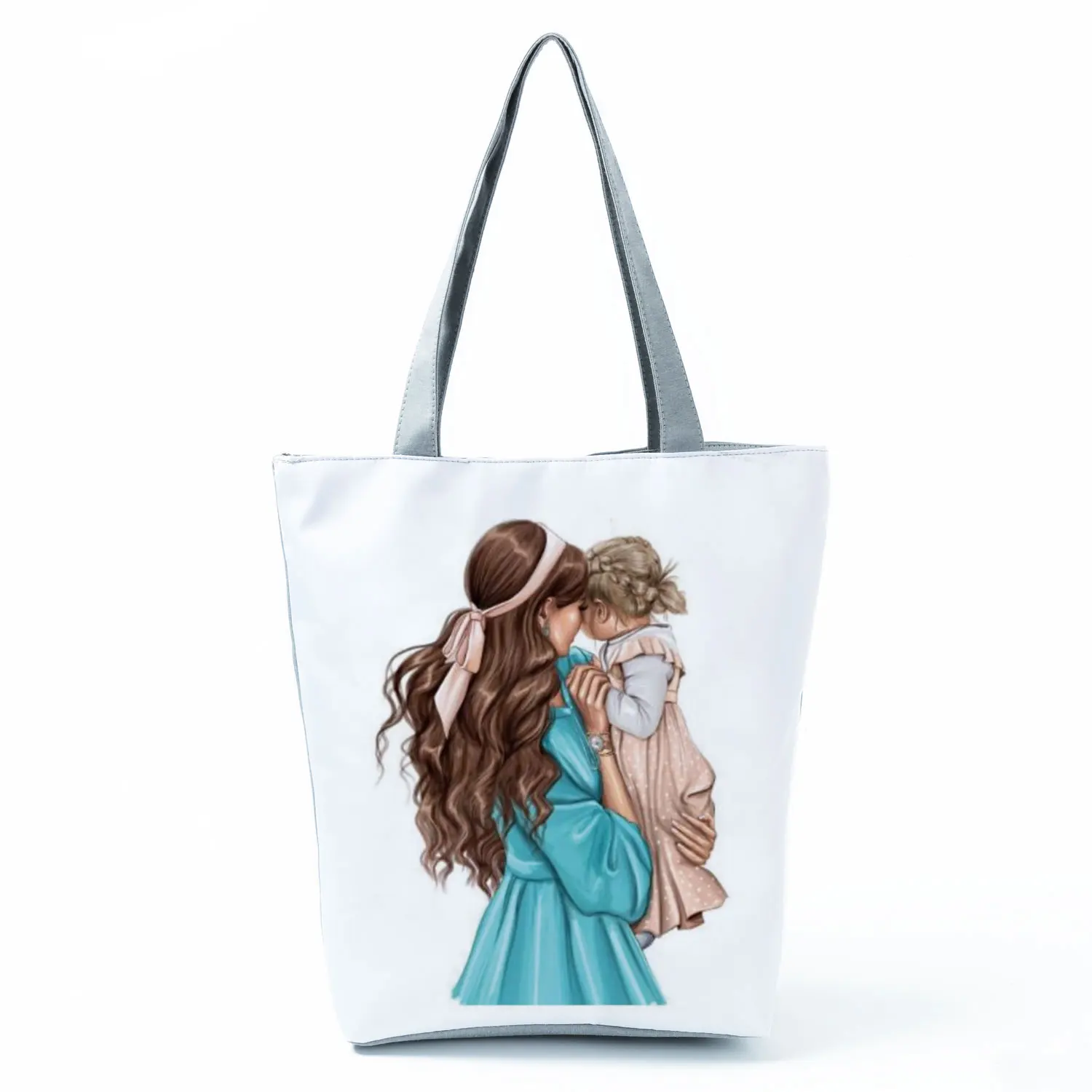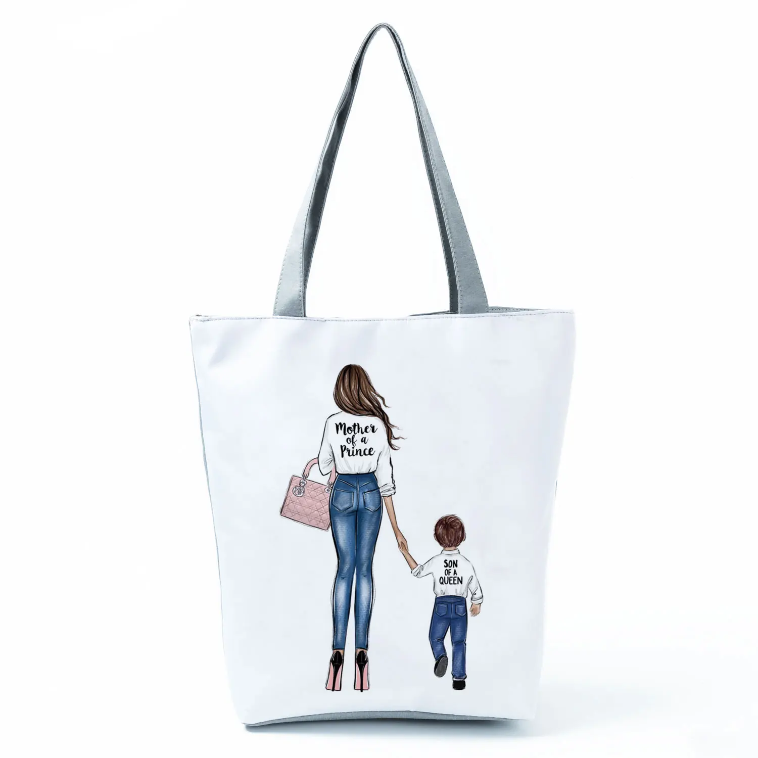 Симпатичные льняные сумки-тоуты с мультипликационным принтом Super Mama, многоразовая сумка через плечо, складные Женские повседневные сумки для мамы и ребенка, женские тканевые сумки-тоуты