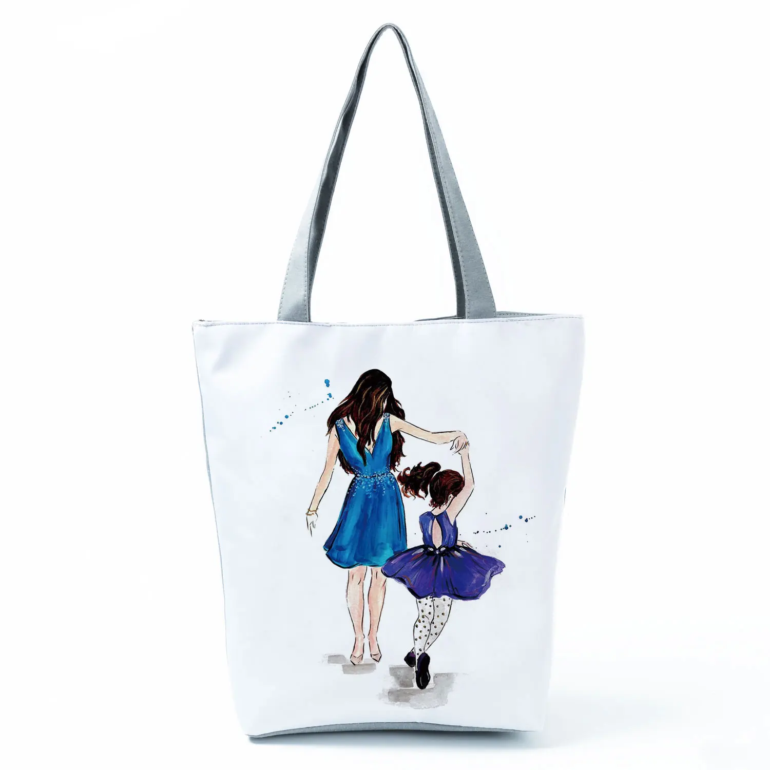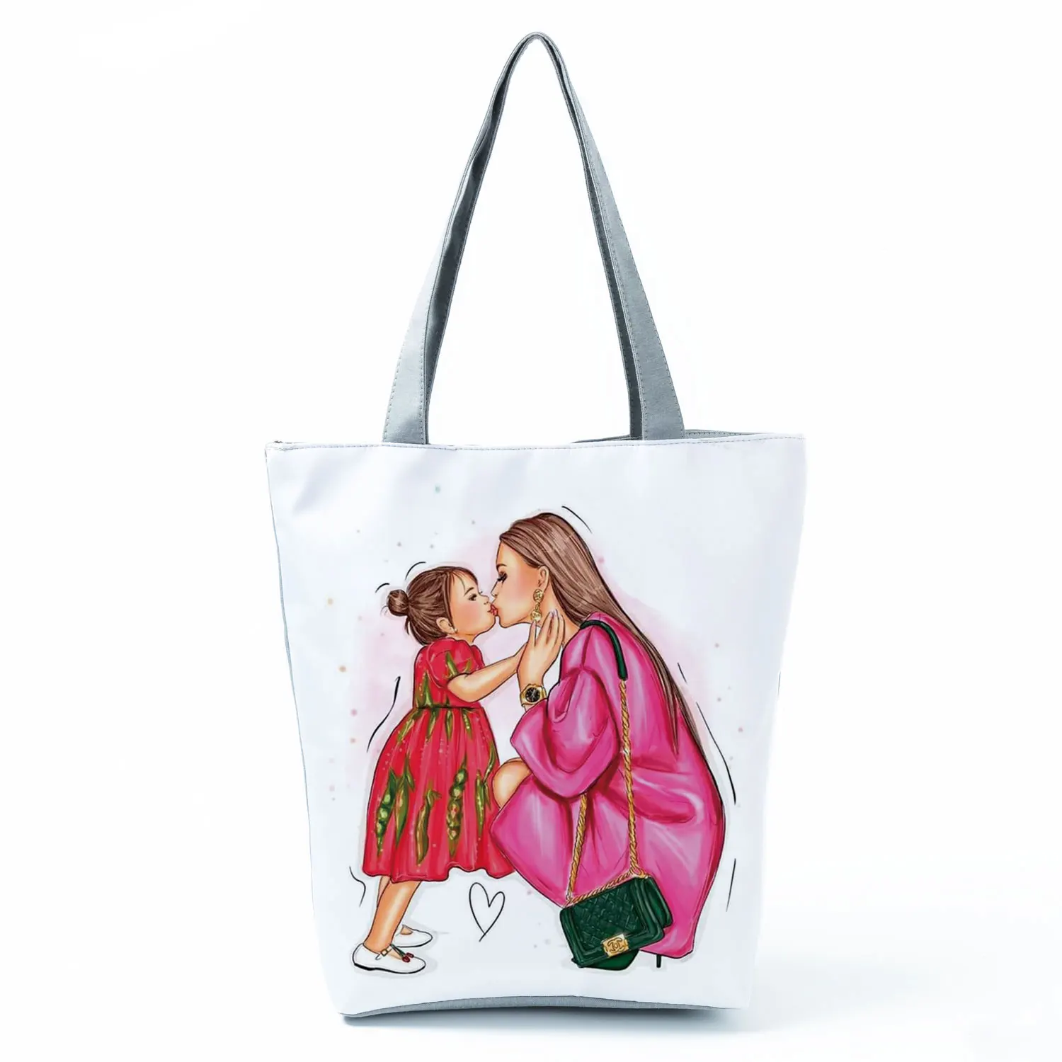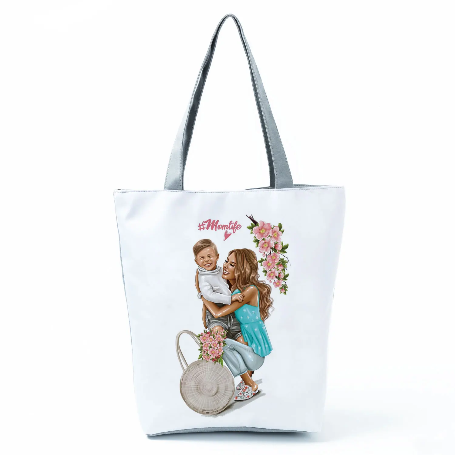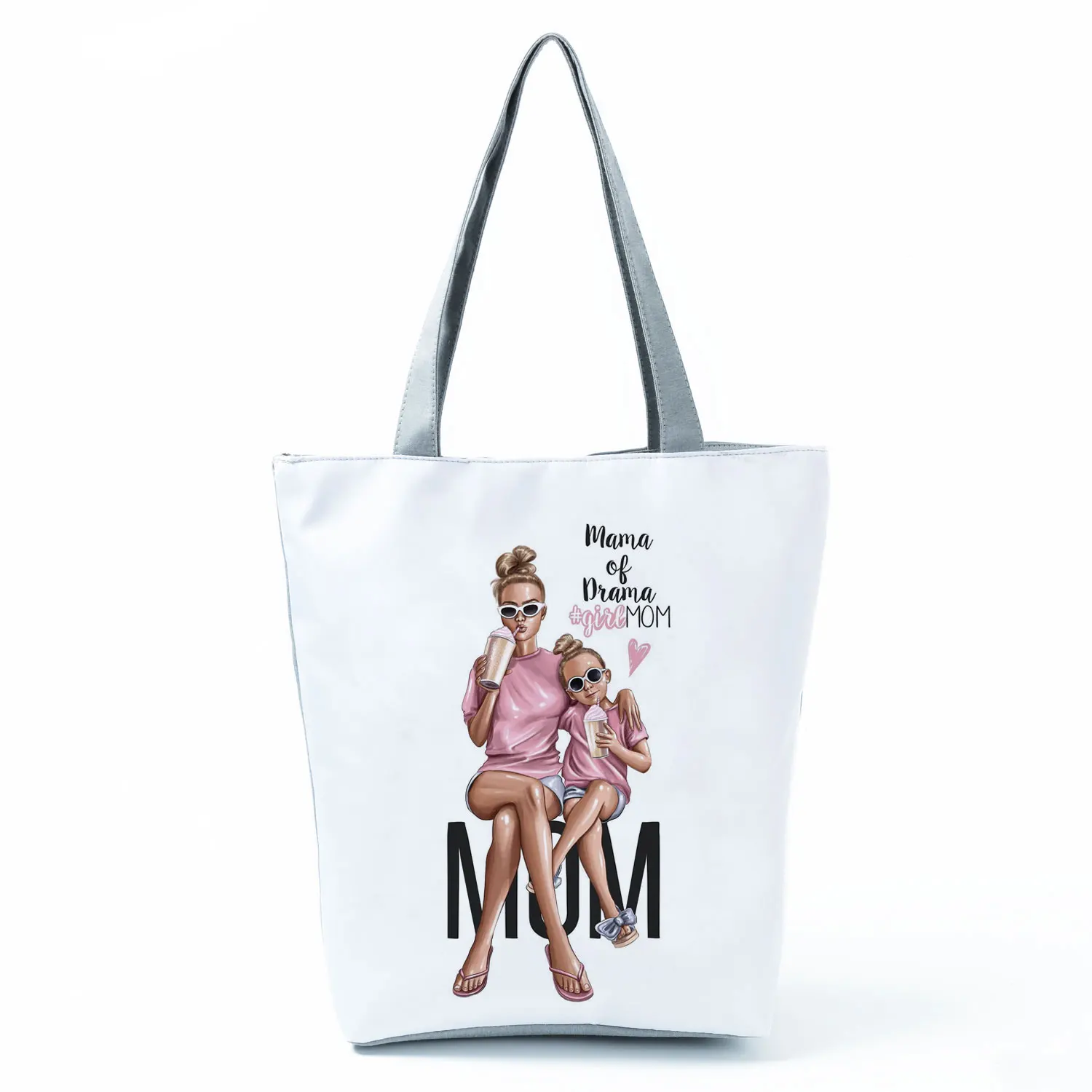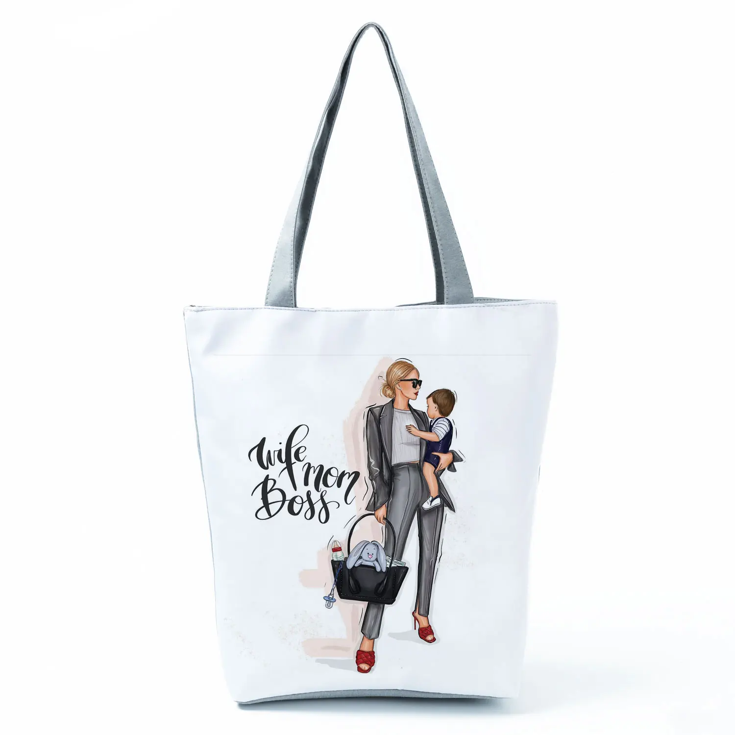 Симпатичные льняные сумки-тоуты с мультипликационным принтом Super Mama, многоразовая сумка через плечо, складные Женские повседневные сумки для мамы и ребенка, женские тканевые сумки-тоуты