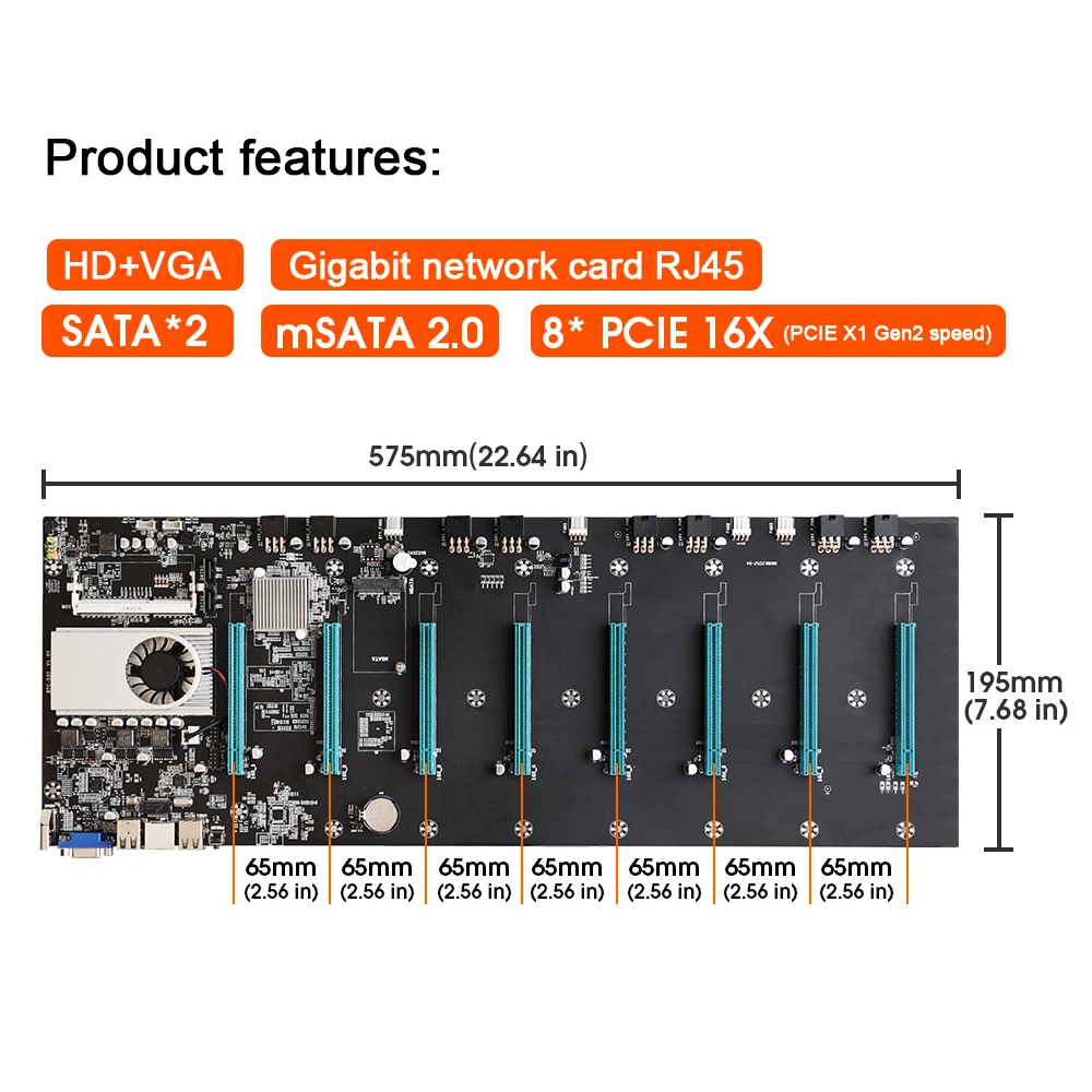 1,8 * PCIE 16X слот для видеокарт, 575 мм интервал.2. Высокая производительность вычислений, на 10% выше, чем Материнские платы того же уровня.3. Оснащен Sodimm DDR3 слотом памяти, 8 * 6PIN PCIE X16 разъем питания, значительно повышает производительность материнской платы.4. Конденсатор стабилизации напряжения может обеспечить стабильное напряжение для вашего оборудования электропитания.5. Он может обеспечить тихую производительность, низкое энергопотребление, меньшее тепловыделение, энергосбережение и безопасное использование.Характеристики:Наименование товара: материнская плата для горнодобывающей машиныМодель: BTC-37Напряжение: 180-240 В/110-240 ВЦвет: черныйРазмер: 575x195 ммПамять: 4G/8GПамять: 1 * DDR3 Sodimm слот, поддержка 1066/1333/1600 МГцХранение: 1 * SATA3.0 + 1 * SATA2.0 + 1 * m SATA2.0USB: 4 * USB2.0Сетевой порт: гигабитный сетевой порт RJ45Расширяемый порт: 8 * PCIE 16X,8*6pin PCIE X16 разъем питания, HDMI-совместимый + VGAPCI-E 8-контактный кабель питания:Цвет: черный + желтыйМатериал: АБС + ПВХ + металлПримечание:-Возможны небольшие погрешности в размере при ручном измерении.-Отклонение цвета может отличаться из-за различных настроек монитора, пожалуйста, поймите.