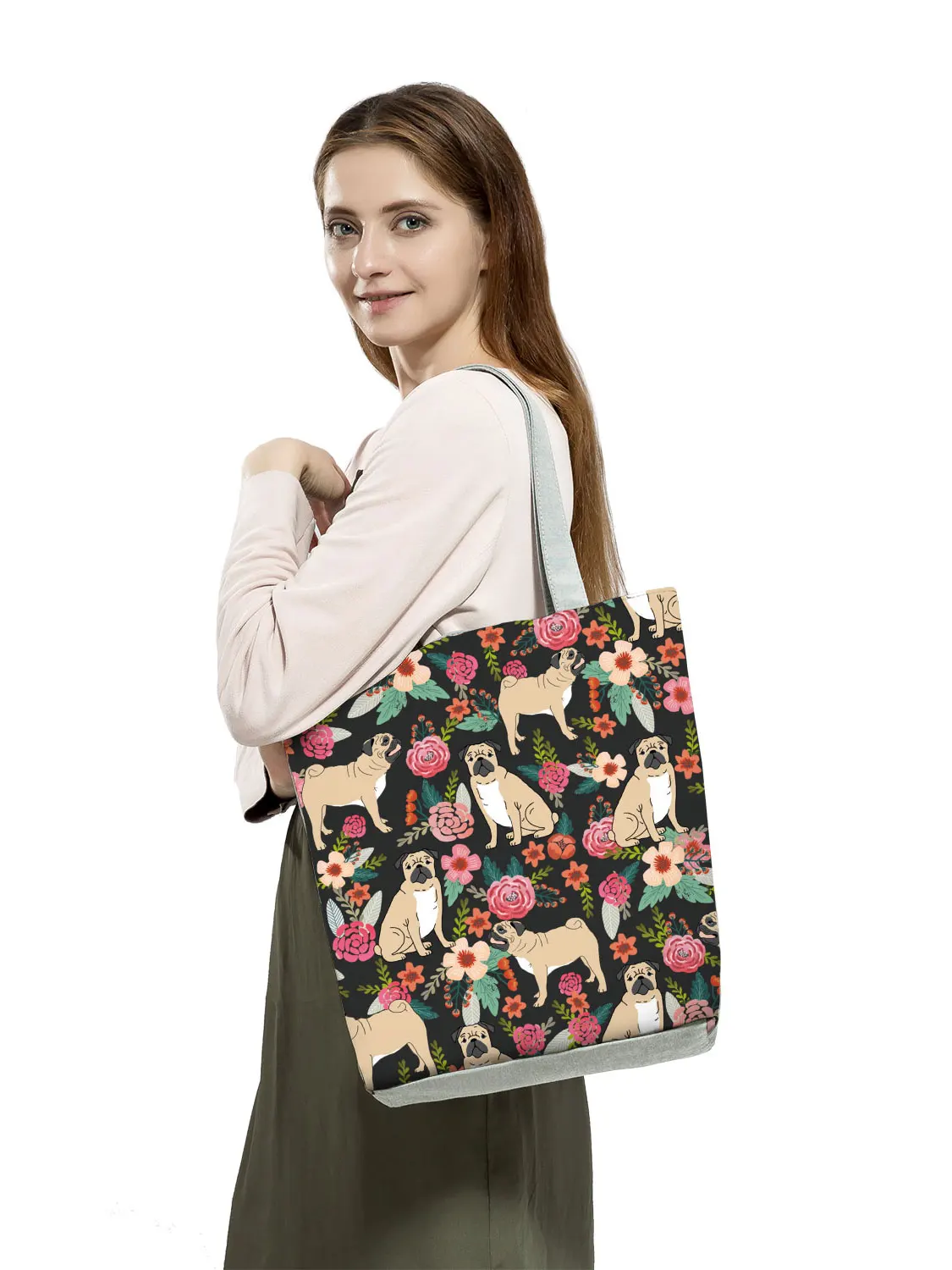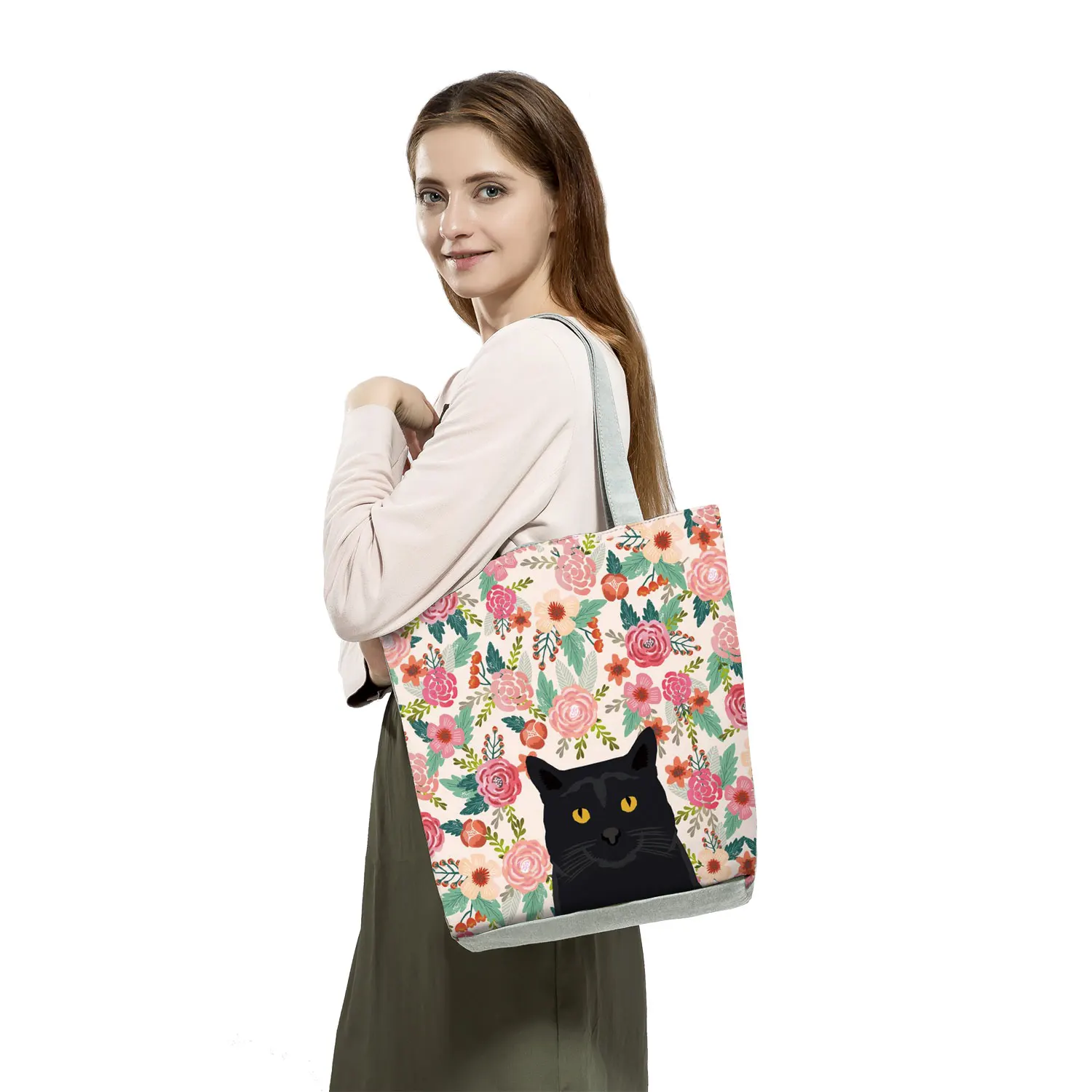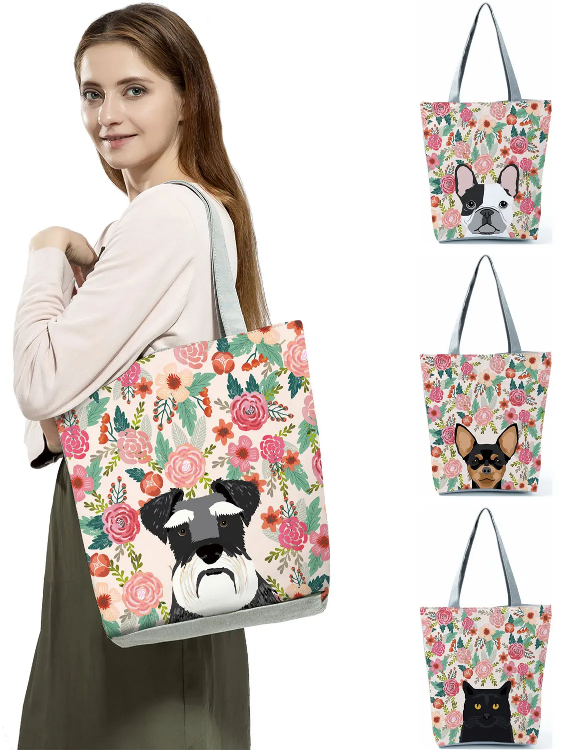 Женская сумка-тоут с цветочным принтом собаки кота повседневная школьная сумка через плечо многоразовые сумки для покупок для супермаркета Прямая поставка