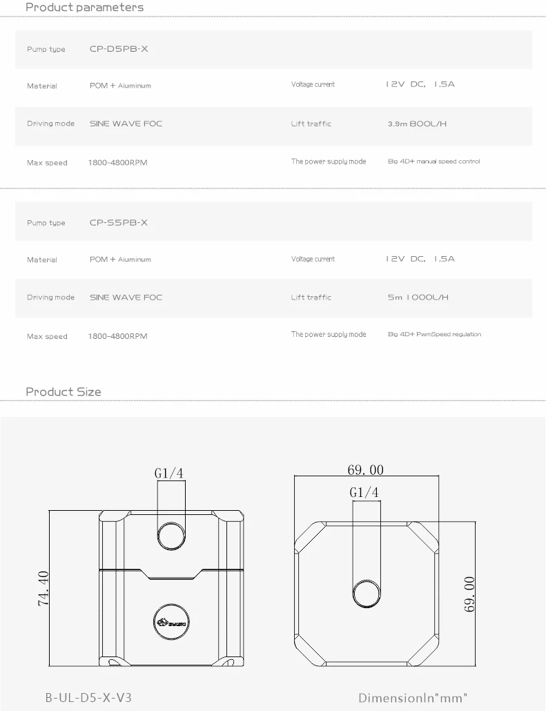 Интерфейс сигнала: большой 4pin + PWM автоматический контроль скоростиТип насоса: насос Pmsm Метод вождения: Синусоидальная волна Технология привода: прочная печатная плата, твердые конденсаторы, патч-датчики Скорость нагрузки: мак4800rpm Потребляемая мощность напряжения: DC12V Выходная головка: 5 м Максимальный поток: 1000л/ч Материал корпуса: помпон + алюминий
