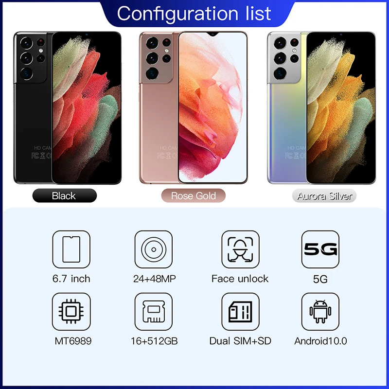 Глобальная версия S21 ультра мобильные телефоны 5G 8 ГБ ОЗУ 128 Гб ПЗУ смартфоны две sim-карты разблокированные мобильные телефоны AndroidИнформация о продуктеМодель: S21 UltraПроцессор: MTK6989 Deca Core, размер экрана (не позднее, чем за 10 сердечник)ОС: Android 10,0Размер экрана: 6,7 дюймов 4K капли воды экранАккумулятор: литий-ионный аккумулятор высокой плотности 6000 мАчЯзык: Поддержка нескольких языковДисплей: 1440*3200Память: 8 Гб RAM + 128 ГБ ROMКамера: фронтальная камера 24 Мп + задняя камера 48 МПSim-карта: двойная Nano sim-картаСеть:2G: GSM 850/900/1800 / 1900 МГц3G: WCDMA 900 / 2100 МГц4G: FDD-LTE: B1 / 3/7/8/19/20Датчик:FaceID, близость, акселерометр, магнитный, гироскоп, Прочие ожерелья и подвески (светильник датчик)Особенности:Поддержка смарт пробуждения, распознавать лица, Wi-Fi + Bt + FM + GPS, микро USB интерфейс, 3,5 мм стандарт для наушников, Bluetooth, с поддержкой OTG, WAP/MMS / GPRS ,Wi-Fi, GPS, гравитация, Сенсор, будильник, календарь, калькулятор, аудио рекордер, видеомагнитофон, WAP/MMS/GPR, просмотр изображений, электронная книга, мировые часы...Посылка:1 x смартфон,1 x адаптер зарядного устройства,1 x зарядный кабель,1 х Наушники,1 x Руководство пользователя,1 x чехол для телефона,Защитная пленка-1 шт.Внимание:Из-за разницы в светильник, в зависимости от фактического цвета телефон может быть s светильник ly отличается от экрана, и товары могут отличаться. Цветовые названия используются только для различия между индивидуальными SKUs. Пожалуйста, поймите это. Спасибо.