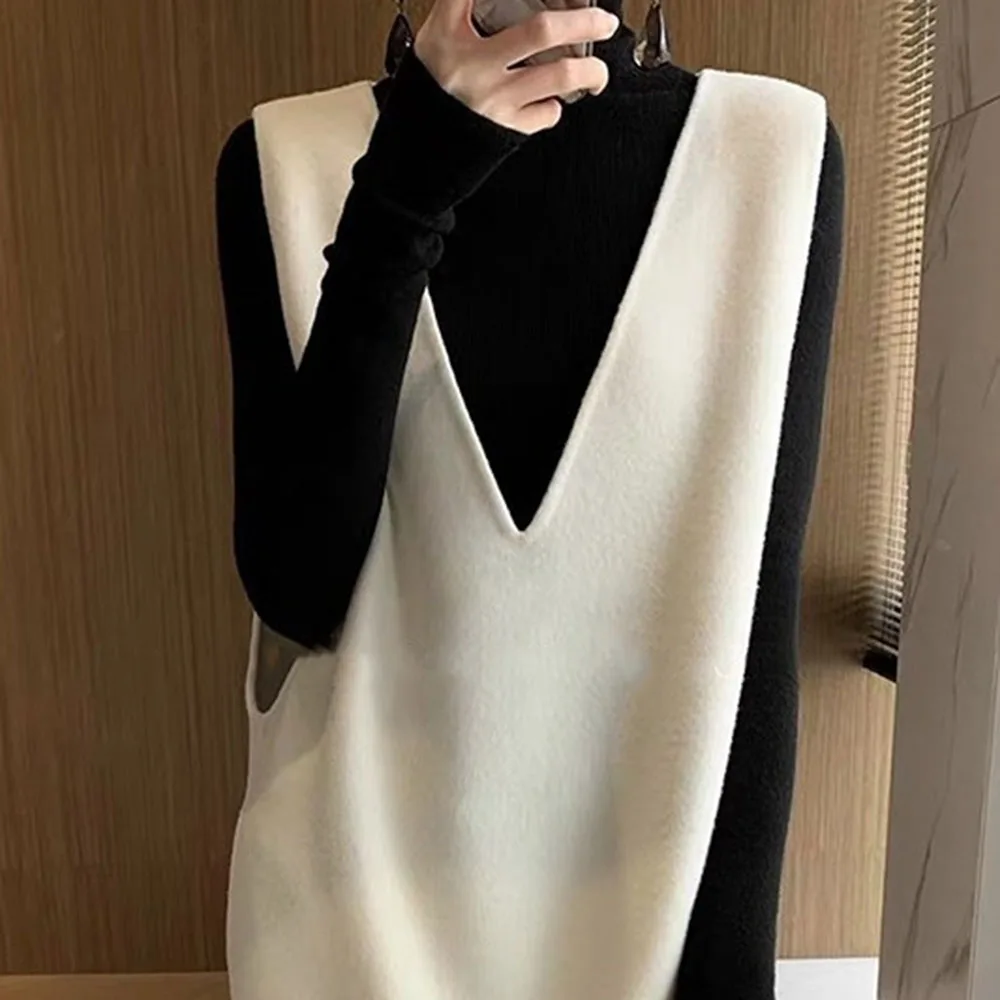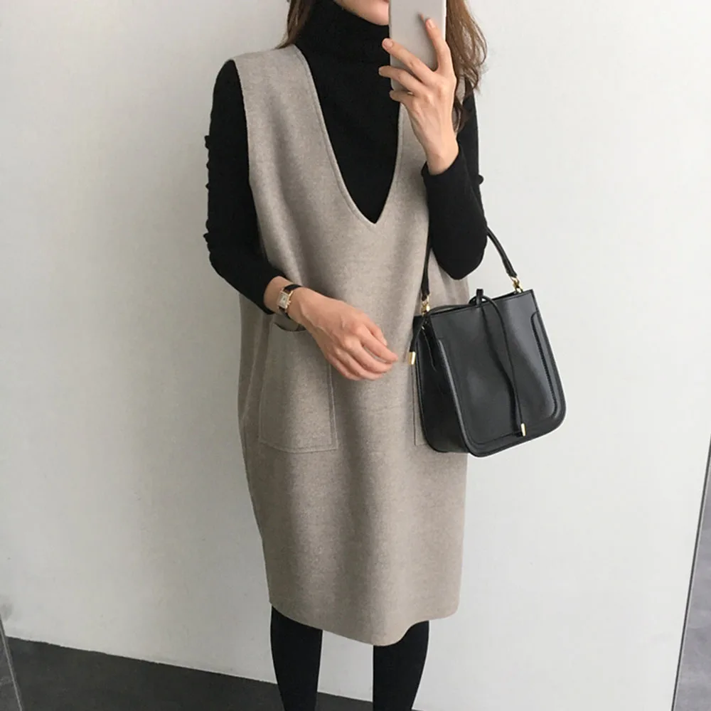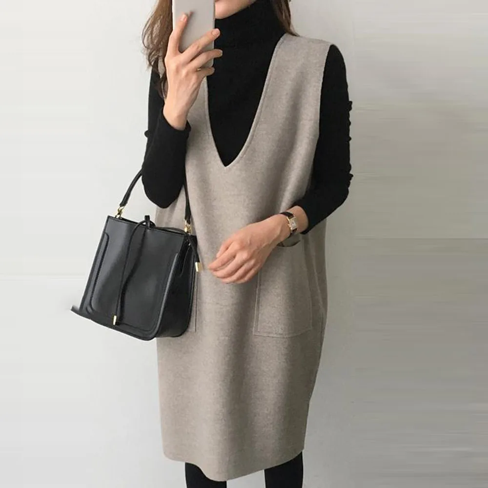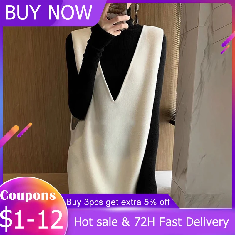 Женское трикотажное платье без рукавов, длинное шерстяное свободное платье-свитер с V-образным вырезом и флисовой юбкой в Корейском стиле, Осень-зима 2021