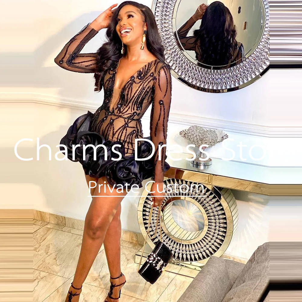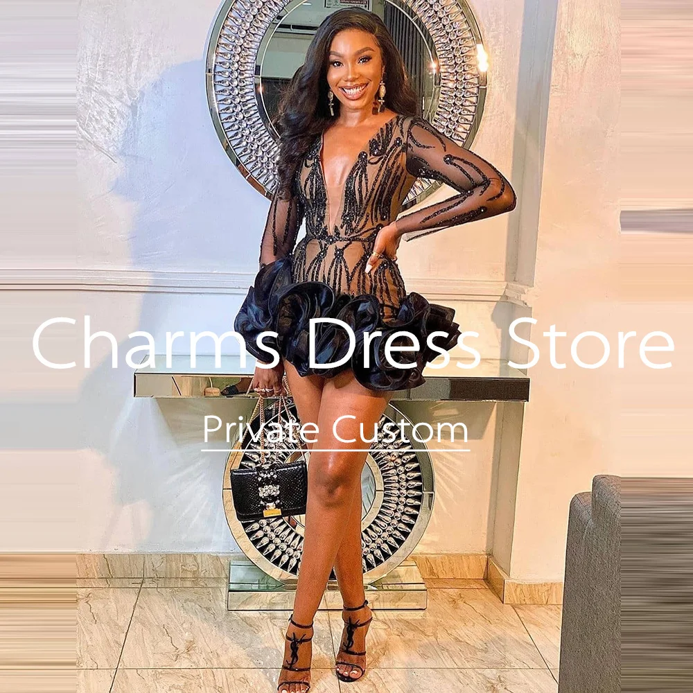 Сексуальное черное вечернее платье с бисером Laxsesu, с оборками, V-образным вырезом и открытой спиной, официальное платье для выпускного вечера, вечерние платья с длинными рукавами 2021