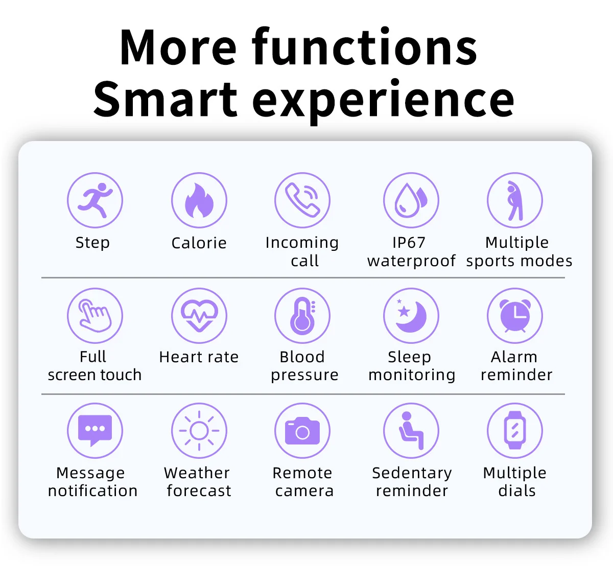 1. Следите за своим здоровьем:Пульс/кровяное давление/мониторинг кислорода в крови, трекер сна, напоминание о сидячем положении, напоминание о воде и т. д.2. Хороший помощник для тренировки:Шагомер, пройденное расстояние/сожженные калории, спортивные режимы.3. Хороший помощник для повседневной жизни:Отклонение входящих звонков, синхронизация уведомлений (входящие звонки, сообщения, социальные сети и т. Д.), будильник, пульт дистанционного управления камерой, поднимите запястье, чтобы разбудить часы, секундомер, найти мой телефон, погоду, несколько циферблатов часов.
