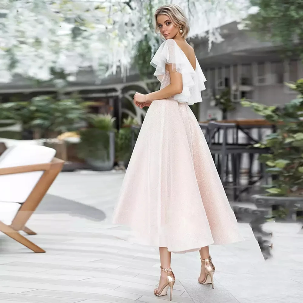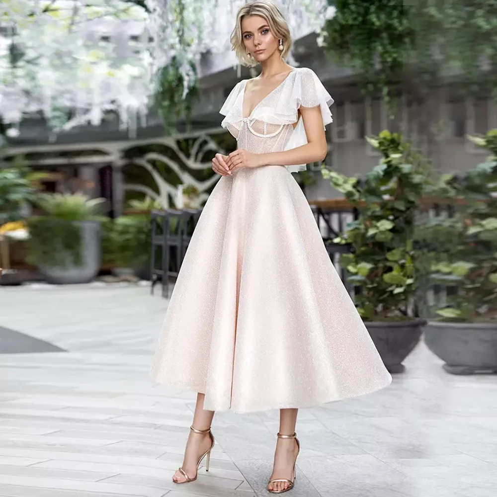 Светло-розовые короткие женские платья для выпускного вечера, вечерние платья с V-образным вырезом для торжества, элегантные длинные вечерние платья без рукавов с блестками
