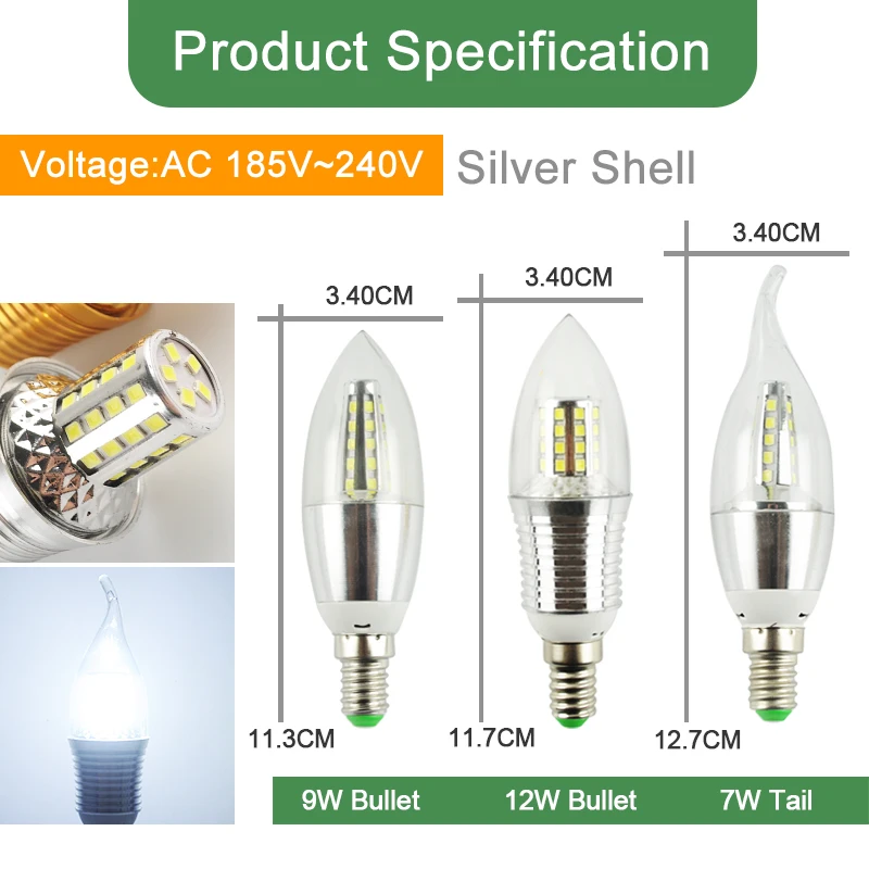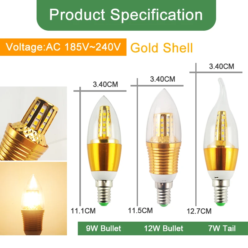Kaguyahime 6 шт.лот Свеча лампа E14 Светодиодная лампа 220 В 7 Вт 9 Вт 12 Вт золотистая серебристая алюминиевая лампа для хрустальной люстры лампа