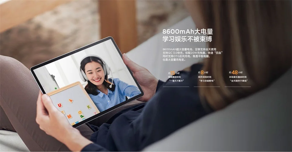 Аккумулятор повышенной емкости 8600 мА · ч, достаточная поддержка для использования в течение дня, поддержка быстрой зарядки QC 3,0, стандартное зарядное устройство 20 Вт, «быстрая» ч. Поддержка обратной зарядки OTG в то же время, оба планшета, большая емкость зарядного устройства.