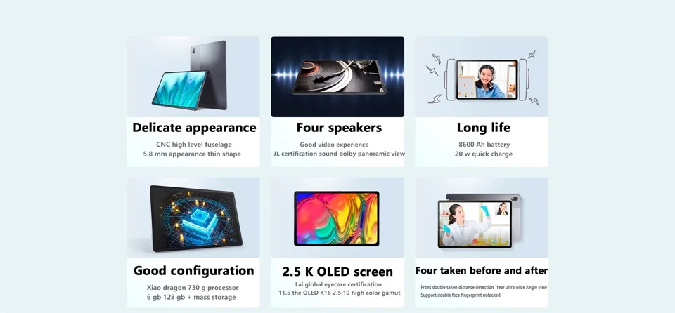 1: ЧПУ высокий уровень 5,8 мм фюзеляжа внешний видТонкая форма2:JBL certification sound dolby panoramicОпыт просмотра видео3:8600 мАч аккумулятор 20 Вт Быстрая зарядка4: процессор Xiao dragon 6 ГБ 730 ГБ + 128 ГБМассовое хранение5:11.5 OLED экран 2,5 K "; Однотонная обувьGamutRhine global eyecare Сертификация6., снято с передней и задней обнаружения ультра широкий угол обзора Поддержка двойной отпечаток лица разблокирован