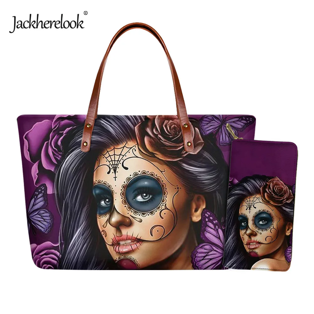 Jackherelook День мертвых женщин ручная сумка женский кошелек набор готический череп Девушка Печать Женский тоут сумка на плечо кошелек для монет