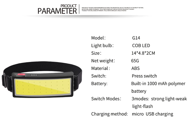 1. Материал: АБС-пластик2. Светодиодный: COB.3. Батарея: со встроенным литий-ионным аккумулятором.4. Зарядка: USB зарядка. (Есть usb-кабель).5. 3 режима: высокая-низкая-вспышка.6. Водонепроницаемость: IPx4. (Без дайвинга).7. Вес: стиль 65 г. B Стиль: 95 г.