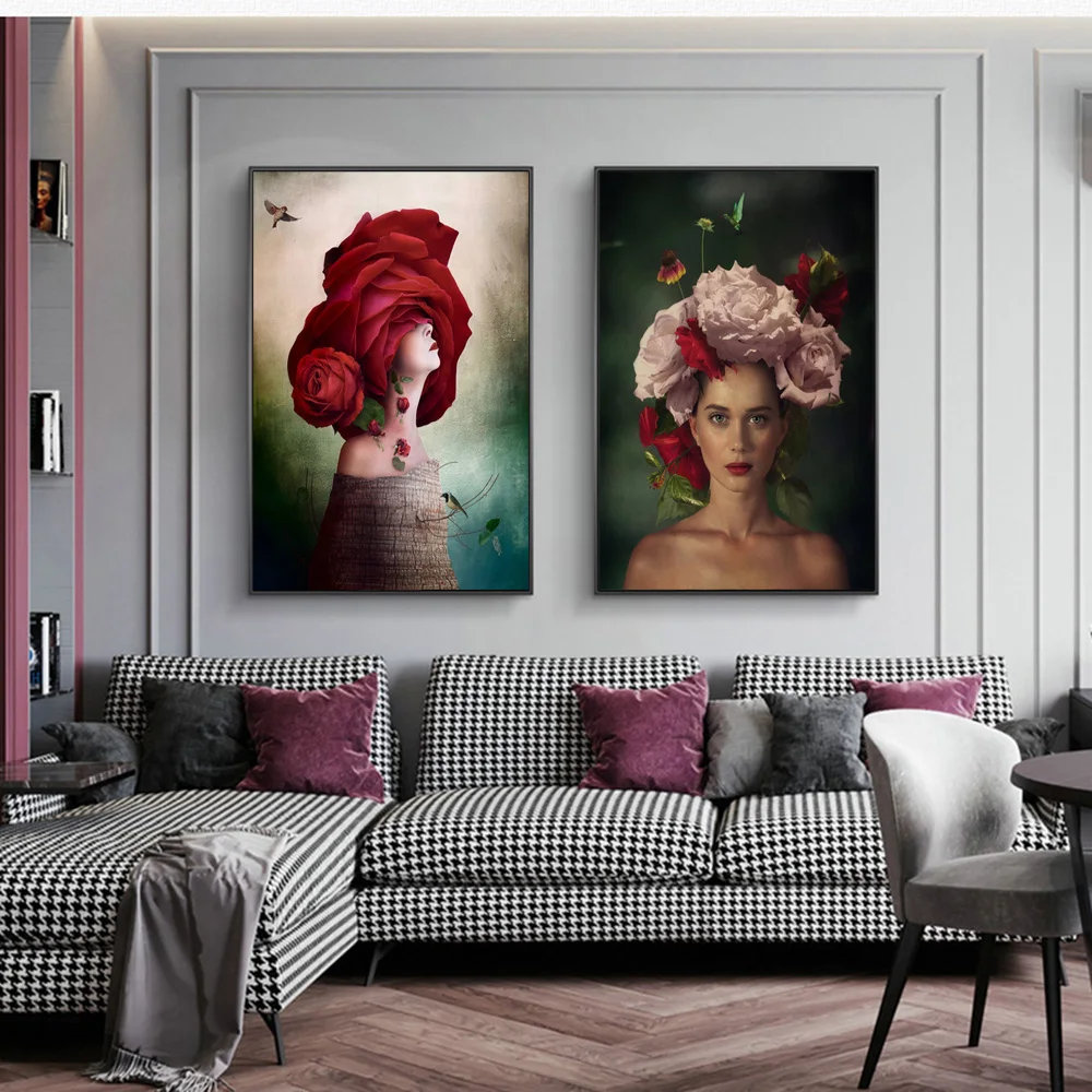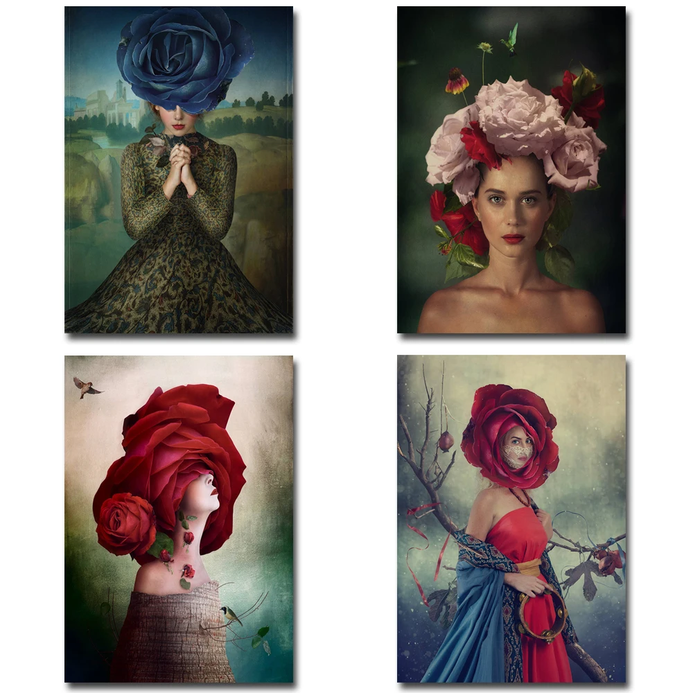 Сюрреалистичность женщина лицо покрытые цветы холст настенные картины художественные плакаты и принты классический декор дома Портретные фотографии