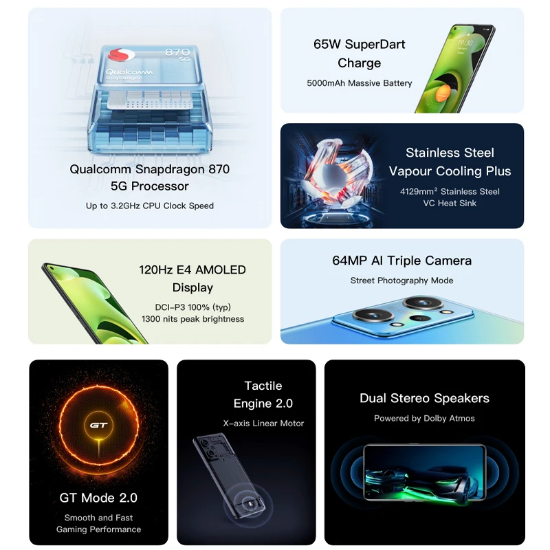 ПроцессорQualcomm Snapdragon 870 5G3,2 ГГц Процессор часы СкоростьПроцессор: восьмиядерных процессор, 2,4 ГГц × 3, 3,2 ГГц × 1, 1,8 ГГц × 4 ,7nm процессаГрафический процессор: Adreno 650ПамятьДо 12 Гб + 256 ГБМассивное хранилищеОЗУ: 8 ГБ, 12 ГбROM: 128 ГБ, 256 ГБUFS 3,1, двойной ROM каналыДисплейРазмер экрана: 6,62 дюймаЧастота обновления: 120 ГцСоотношение между экраном и корпусом: 92.60%Частота дискретизации касания: 600 ГцРазрешение: 1080 × 2400 FHD +Экран PPI: 397Пиковая Яркость: 1300 нитКонтрастность: 5000000:1Насыщенность цвета: Typ 106% NTSCЦветовое пространство: 100% DCI-P3Зарядка и батареяЗаряд супердарта 65 Вт5000 мАч массивная батарея100% батарея до 36 мин2*2440 мАч (номинальная) емкость аккумулятора2*2500 мАч (типичная) емкость аккумулятораКамераОсновная камера 64 мпШирокоугольная камера 119 °Основная камераОбъектив: 6PДиафрагма: F1.8FOV: 78,6 °Фокусное расстояние: 26 ммЗапись видео:Ночное видео, ультра стабильное видео, видео боке, видео красота, видео фильтр, двойной вид видео, медленное движение, промежуток времени, Режим киноШирокоугольная камераОбъектив: 5PДиафрагма: F2.3FOV: 119 °Фокусное расстояние: 15,7 ммКамера Марко 4 смОбъектив: 3PФокусное расстояние: 21,88 ммФункция фотографии:Режим 64MP, Супер Ночной пейзаж, панорамный вид, профессиональный, Bokeh, HDR, Ультра широкоугольный, ультра макро, распознавание сцен AI, красота AI, фильтр, режим Dazzle Color, текстовый сканер, коррекция портретных искажений, сдвиг наклона, Звездный режим, режим уличной фотосъемки16MP в-дисплей монопод для селфиФронтальная камераОбъектив: 5PДиафрагма: F2.5FOV: 78 °Размер датчика: 1/3.09''Функция фотографии:Портрет Bokeh, видео с временными интервалами, панорамный вид, красота, HDR, распознавание лица, фильтр, зеркальное изображение, Супер Ночной пейзаж, регулируемая боке, коррекция портретных искаженийЗапись видео:Поддержка 1080P @ 30 кадров в секунду, 720P @ 30 кадров в секундуСотовая и беспроводнаяПоддержка 5G2 Nano слота для карт5G номер:SA:N41(2515-2675 МГц)/N78/N1/N3/N5/N8/N28A)NSA:N41(2515-2675 МГц)/N77/N782/3/4G:GSM 850/900/1800/1900WCDMA B1/B2/B4/B5/B6/B8/B19TD-LTE B34/B38/B39/B40/B41(2515-2675 МГц)LTE FDD B1/2/3/4/5/7/8/18/19/26/28AПодключениеДвухчастотный GPSВерсия Bluetooth: 5,2Аудио кодек Bluetooth: SBC, AAC, APTX, APTX_HD, IDAC, IHDCФункции NFCДатчикиДатчик магнитной индукцииСветильник с датчикомДатчик приближенияГироскопа, что наши производственные мощностиДатчик ускоренияОптический отпечаток пальца на дисплееКонфиденциальностьФункции блокировки телефона:Разблокировка лица, разблокировка отпечатков пальцев, разблокировка паролем, разблокировка узора, Google Smart LockПоддержка:Влажная разблокировка отпечатков пальцев/разблокировка лица/идентификация номера/шифрование файлов/личное пространство/личные приложения/Личная защитаРазмер и весДлина: 162,9 ммШирина: 75,8 мм: Материал подошвы: полиуретан толщина 8,6 ммВес: 200 г* Данные предоставлены realme Lab. Из-за различных методов измерения фактические данные могут иметь разумный диапазон допуска.Кнопки и портыUSB Type-CДинамикДвойные микрофоны с шумоподавлениемОперационная системаRealme UI 2,0На базе Android 11Упаковочный листRealme GT NEO 2Кабель USB Type-CАдаптер для зарядки 65 ВтИгла для sim-картыЗащитная пленка для экранаЗащитный чехолБыстрая направляющаяВажная информация о продукте (включая гарантийный талон)