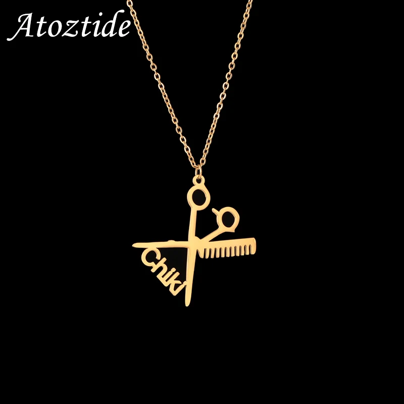 Ожерелье Atoztide с именем на заказ, чокер из нержавеющей стали, парикмахерские ножницы, табличка с именем, Парикмахерская, ювелирные изделия, мужской Рождественский подарок