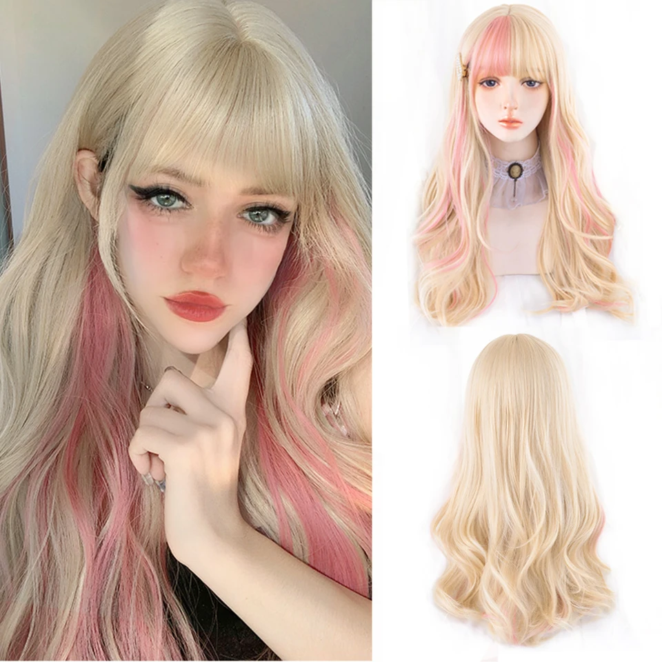 Парик HOUYAN с длинными волнистыми вьющимися волосами, синтетический с розовым и белым градиентом, с челкой для косплея, с розовой, фиолетовой, синей лентой для волос в стиле "Лолита", с натуральным wi-Fi