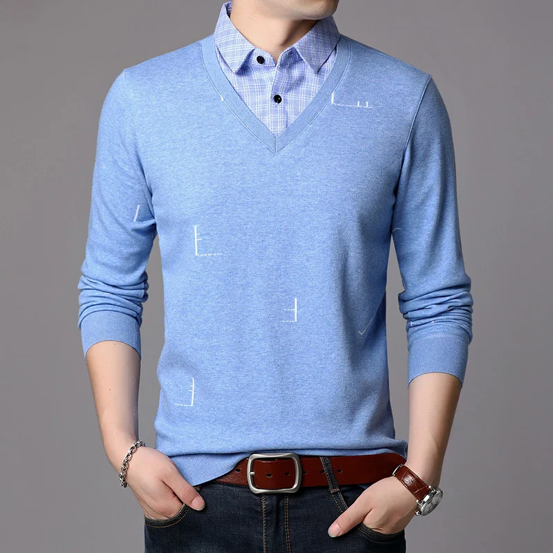 Брендовый пуловер, Модный высококачественный вязаный клетчатый корейский свитер с воротником-рубашкой, имитация двух свитеров с V-образным вырезом, повседневный джемпер, Мужская одежда, 2021