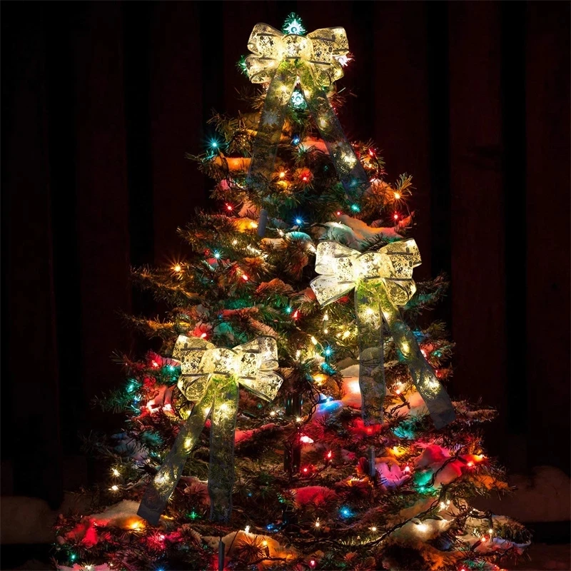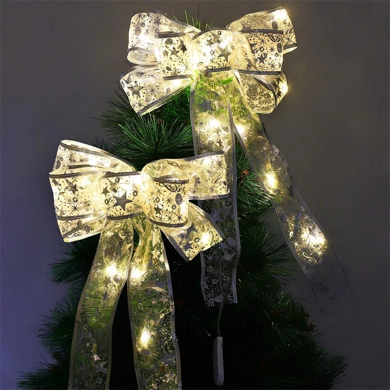 Большой Рождественский бант 35 см, светящийся бант, Серебряный Печатный бант со светодиодными лампочками, рождественский подарок, украшение для банта, товары для Рождества