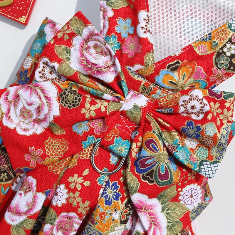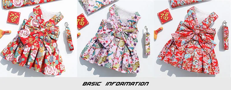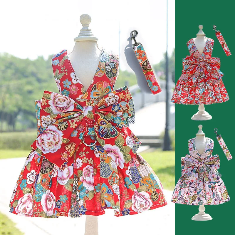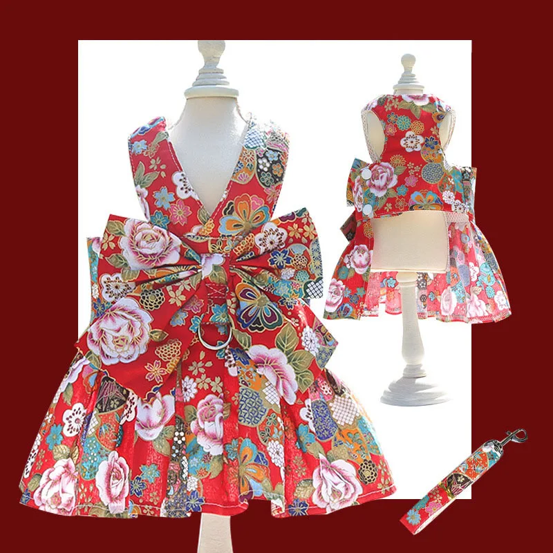 Комплект для собаки в китайском стиле с подвязкой и поводком, платье для французского бульдога, одежда для маленьких собак, товары для нового года, чихуахуа