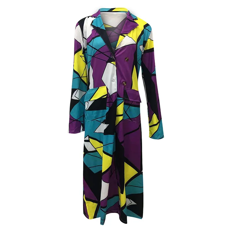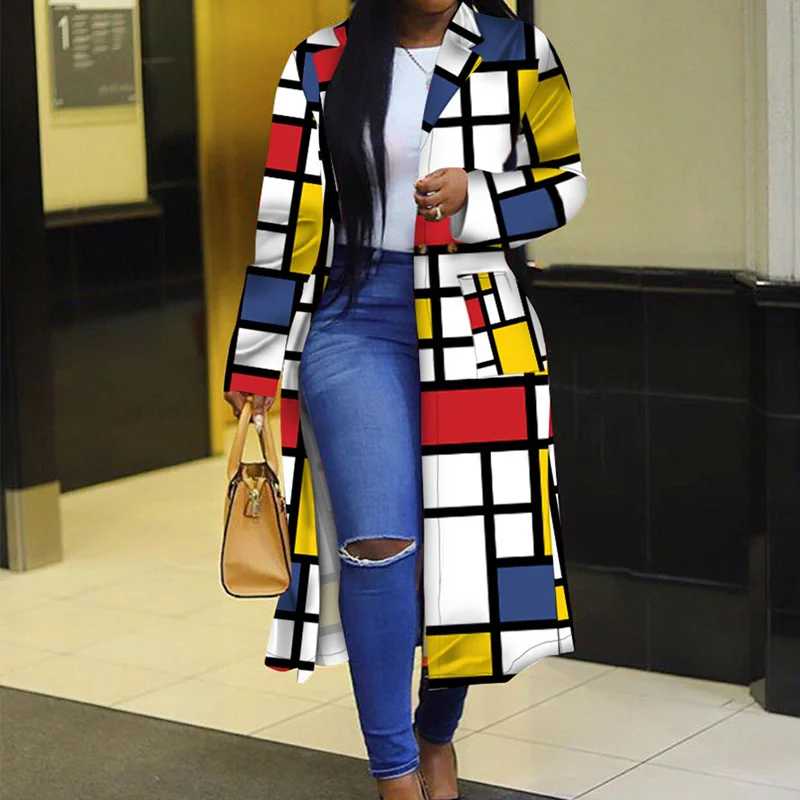 Женская ветровка в клетку с принтом, длинное пальто с отложным воротником, с двойными пуговицами, без пояса, уличный хиппи, модная, новая серия для осени 2021