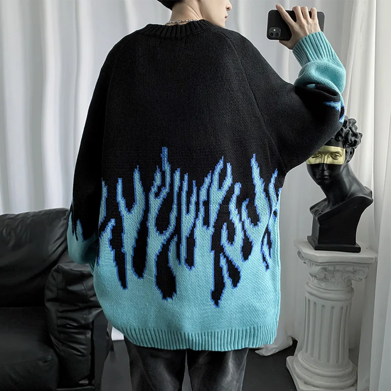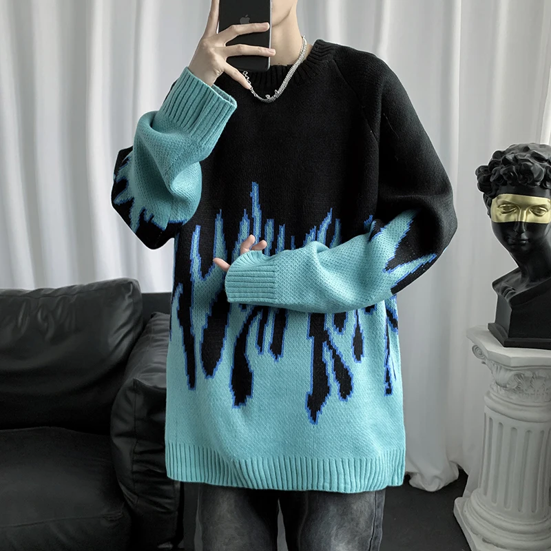 Пуловеры мужские в стиле Харадзюку, винтажный свитер с принтом пламени, уличная одежда в стиле хип-поп, трикотажная уличная одежда, свободные дизайнерские теплые зимние Джемперы для мужчин