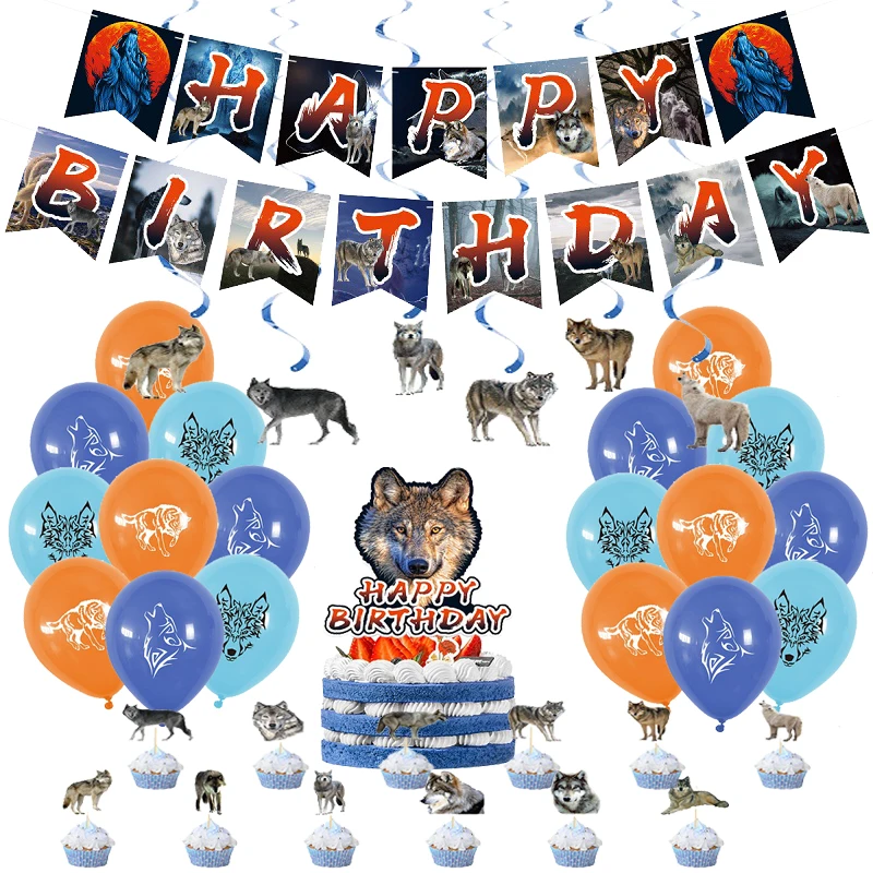 Набор украшений для дня рождения с волком, баннер на день рождения ребенка, топперы в виде джунглей с животными и капкейками, шары из латекса, спиральные подвески, шары