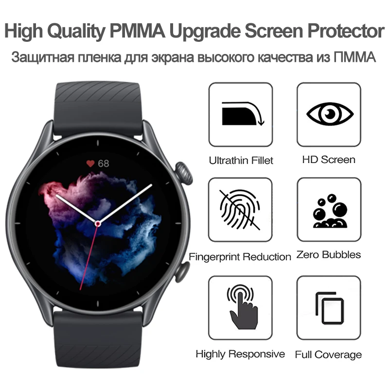Amazfit GTS3Amazfit GTR 3Amazfit GTR 3 ProХарактеристики: Защита от царапин, ультратонкий, HD прозрачныйСовет: товары являются мягкой пленкой, а не стеклянной пленкой.Посылка:Защитная x1-2pcs для экранаВлажная чистящая ткань с спиртовой x1-2pcsСухие салфетки для чистки x1-2pcsПылезащитное снятие наклейка x1-2pcs(Модель и количество по вашему выбору)* Только аксессуары, часы в комплект не входят.* Больше других моделей и аксессуаров, пожалуйста, найдите в нашем магазине.