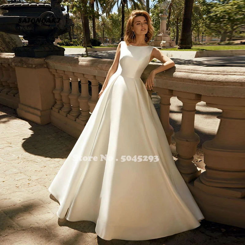 Простое свадебное платье А-силуэта без рукавов с открытой спиной ат...