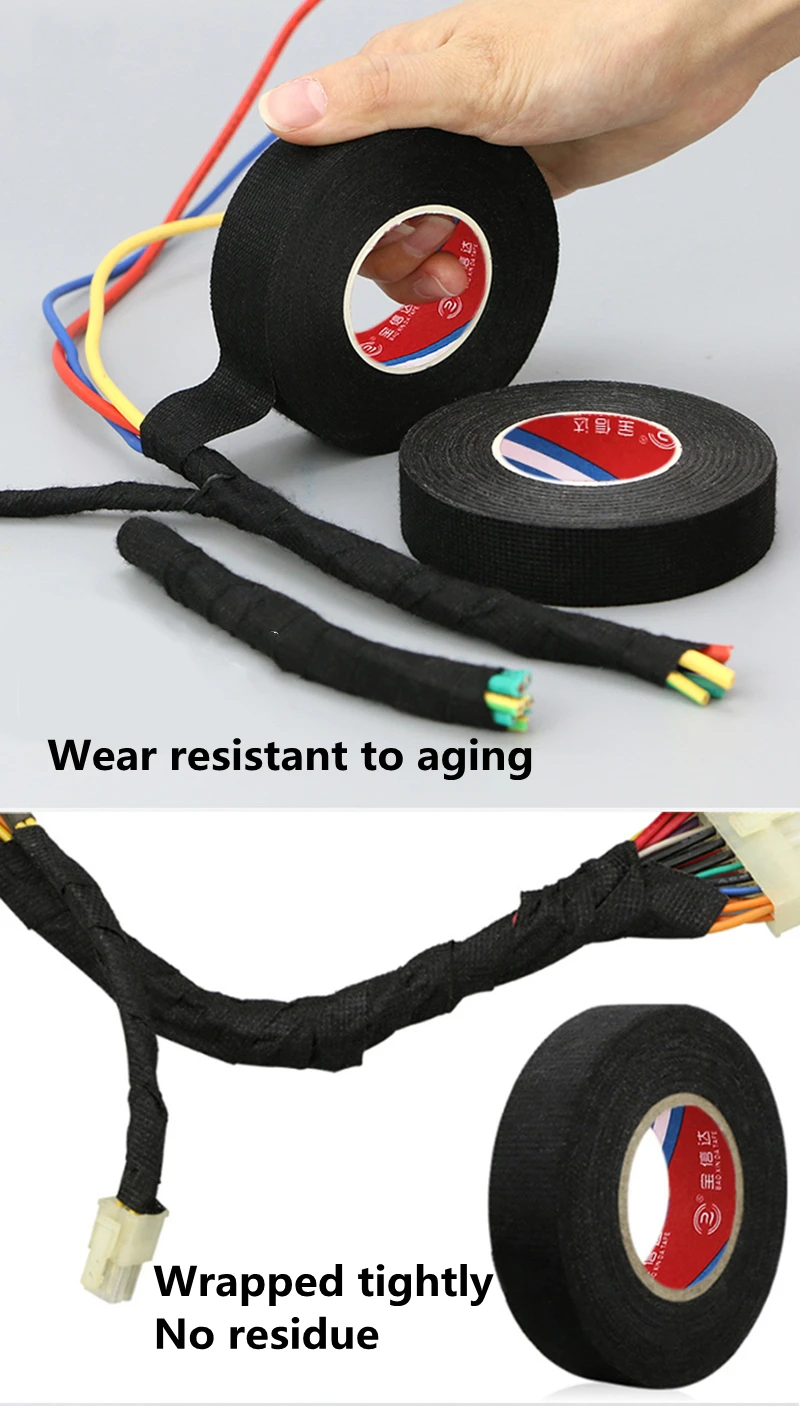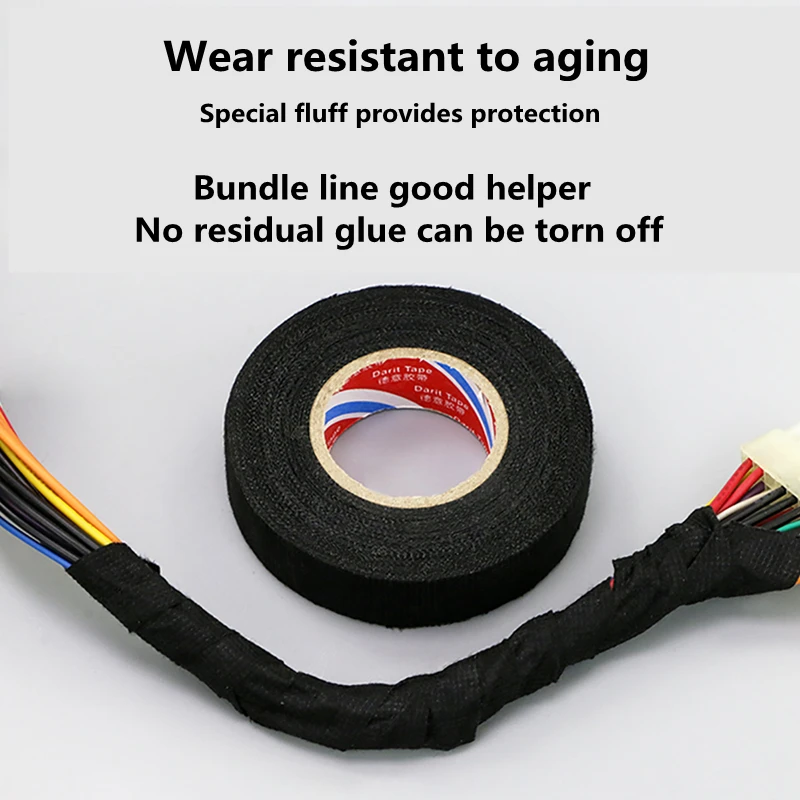 Соединительная Проводная лента, характеристики продукта Звукопоглощающая ПЭТ Нетканая лента, натуральный резиновый клейкий материал. ПЭТ Нетканая лента является гибкой и износостойкой, устойчивой к старению, ручному разрыву Цвет: Черный Длина 15 м, в основном используется в кабельных комплектах для транспортных средств внутренней обмотки жгутов