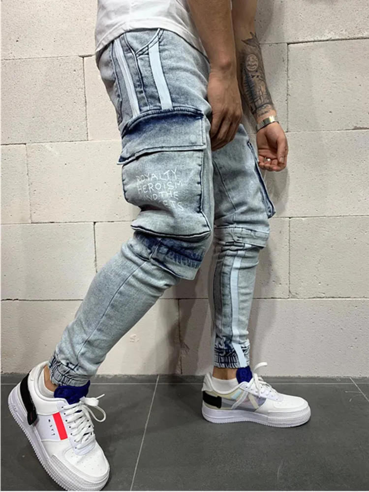 Мужские джинсы в полоску сбоку, брюки-карандаш в стиле хип-хоп, облегающие джинсы со множеством карманов, мужские брюки-карго для бега, 2021