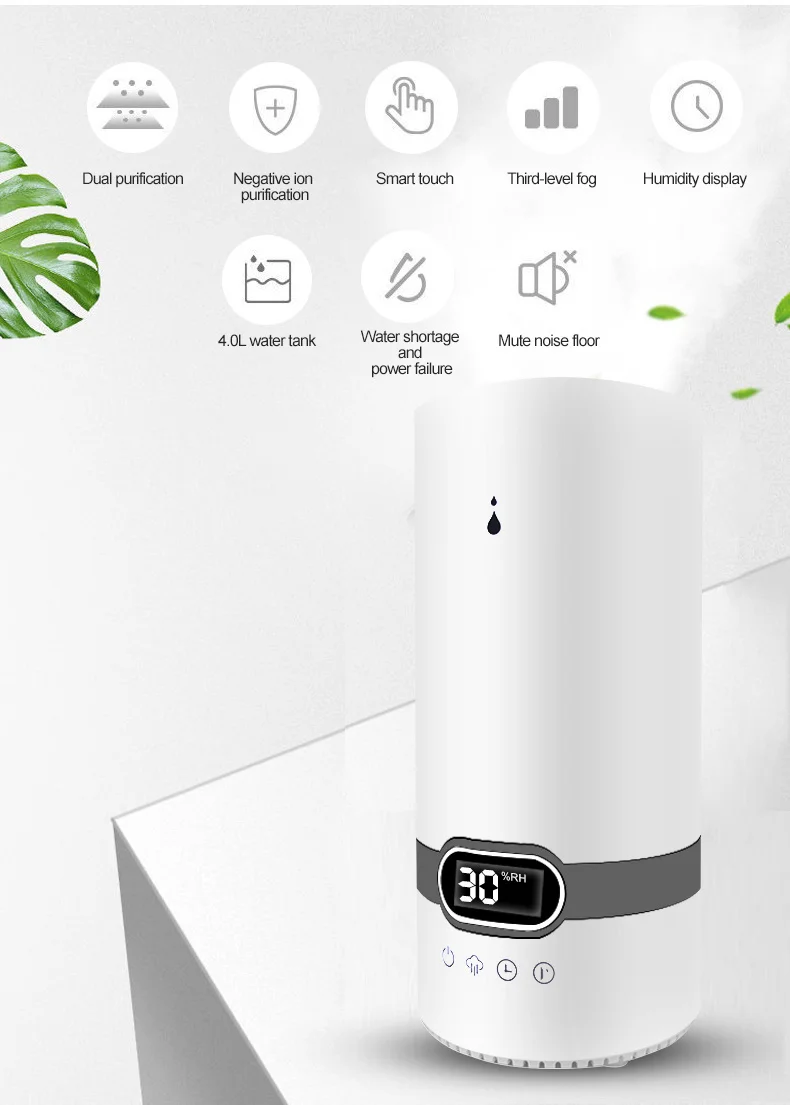 Двойная очисткаОчистка отрицательных ионовSmart touch; Противотуманные фары третьего уровняВлажность дисплея; 4.0L бак для водыНедостаток воды и отключение питанияБесшумный бесшумный пол