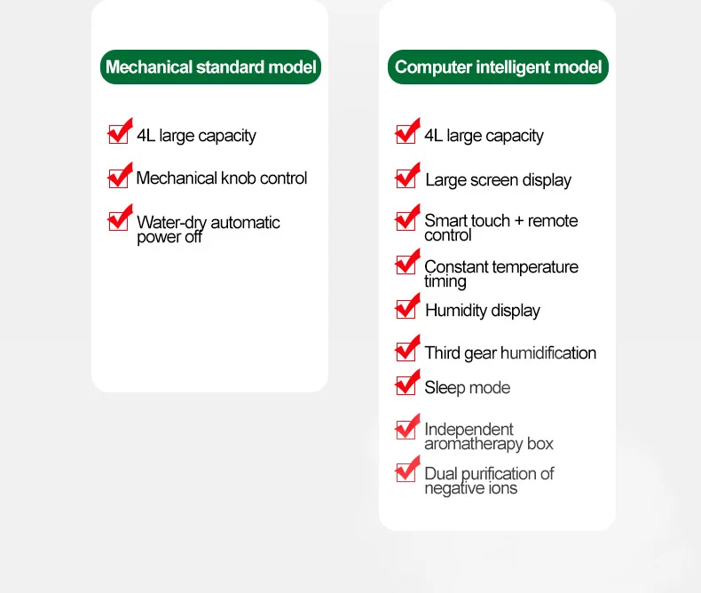 Механическая стандартная модель:4л большой емкости;Механическое управление ручкой;Автоматическое выключение водыИнтеллектуальная модель компьютера:4л большой емкости; Большой экран;Умный сенсорный + пульт дистанционного управленияВремя постоянной температурыДисплей влажностиУвлажнение третьей передачиРежим снаНезависимая коробка для ароматерапииДвойная очистка отрицательных ионов;