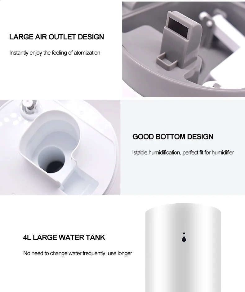 Большой дизайн воздуховодаМгновенно Наслаждайтесь ощущением распыления;Хороший дизайн нижней частиСтабильное увлажнение, идеально подходит для увлажнителя;4L большой резервуар для водыНе нужно часто менять воду, использовать дольше