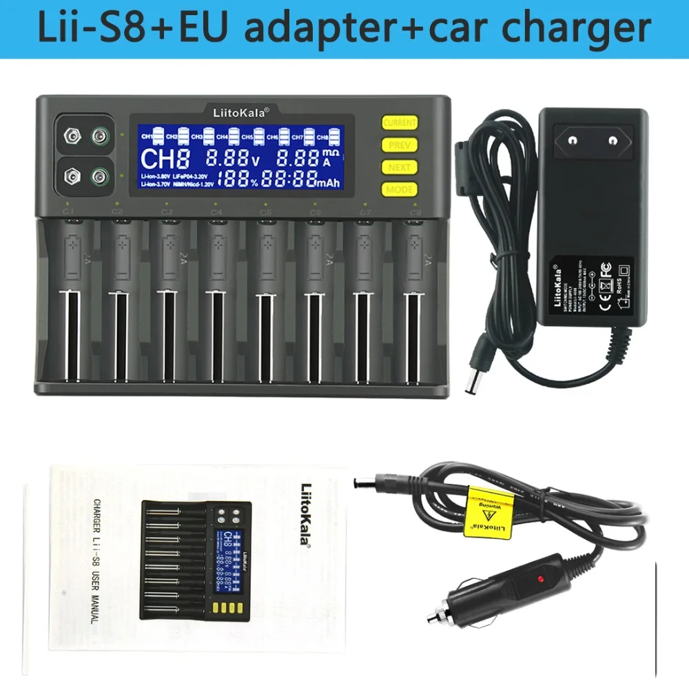 Зарядное устройство LiitoKala Lii-S8, 8слотов, с ЖК-дисплеем, для литийионных, никель-металлогидридных, литий-железо-фосфатных, никель-кадмиевых аккумуляторов 9В, 21700, 20700, 26650, 18650, RCR123, 18700