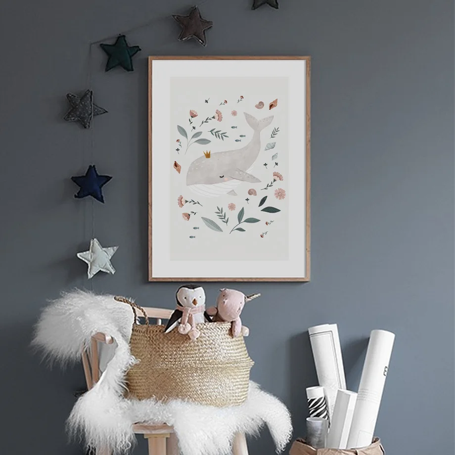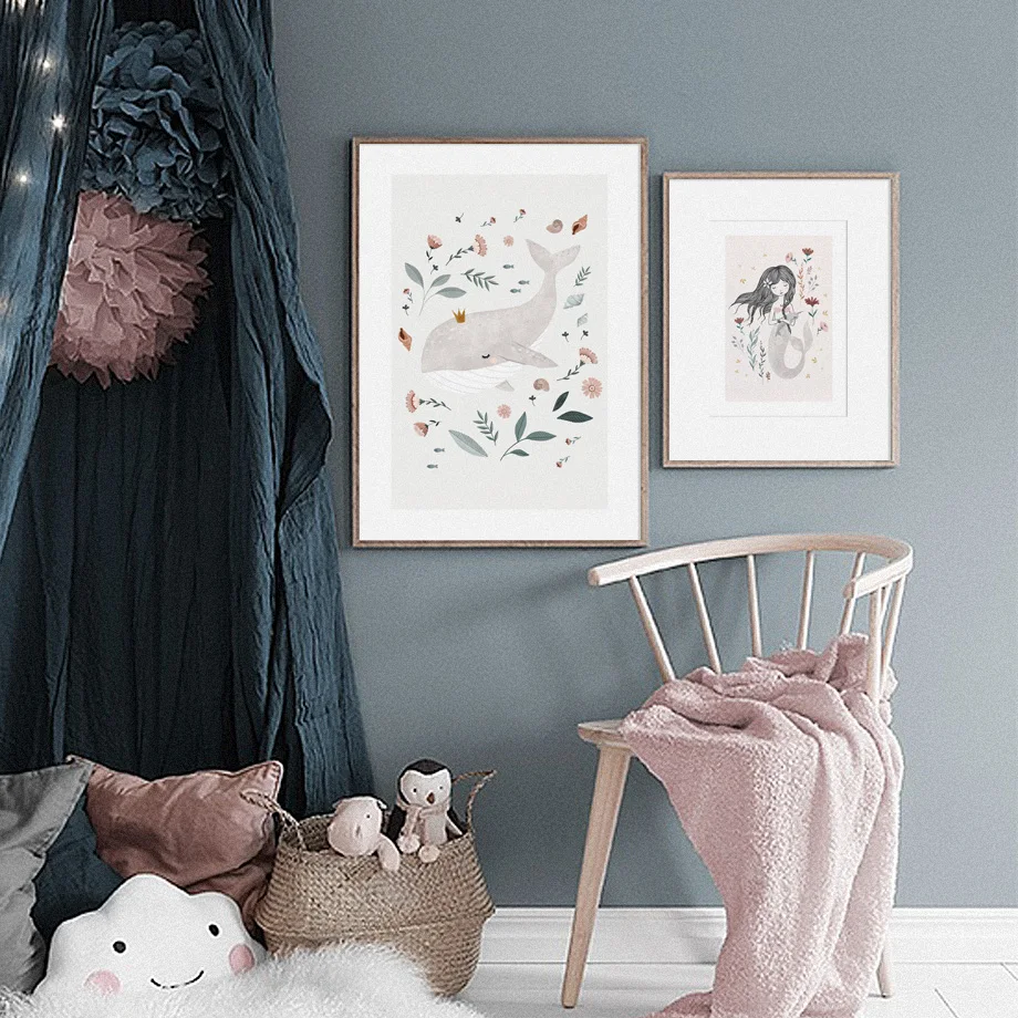 Мультяшный КИТ Русалка Цветок Листья настенная бумага Картина на холсте скандинавские плакаты и принты декоративные картины для детской комнаты
