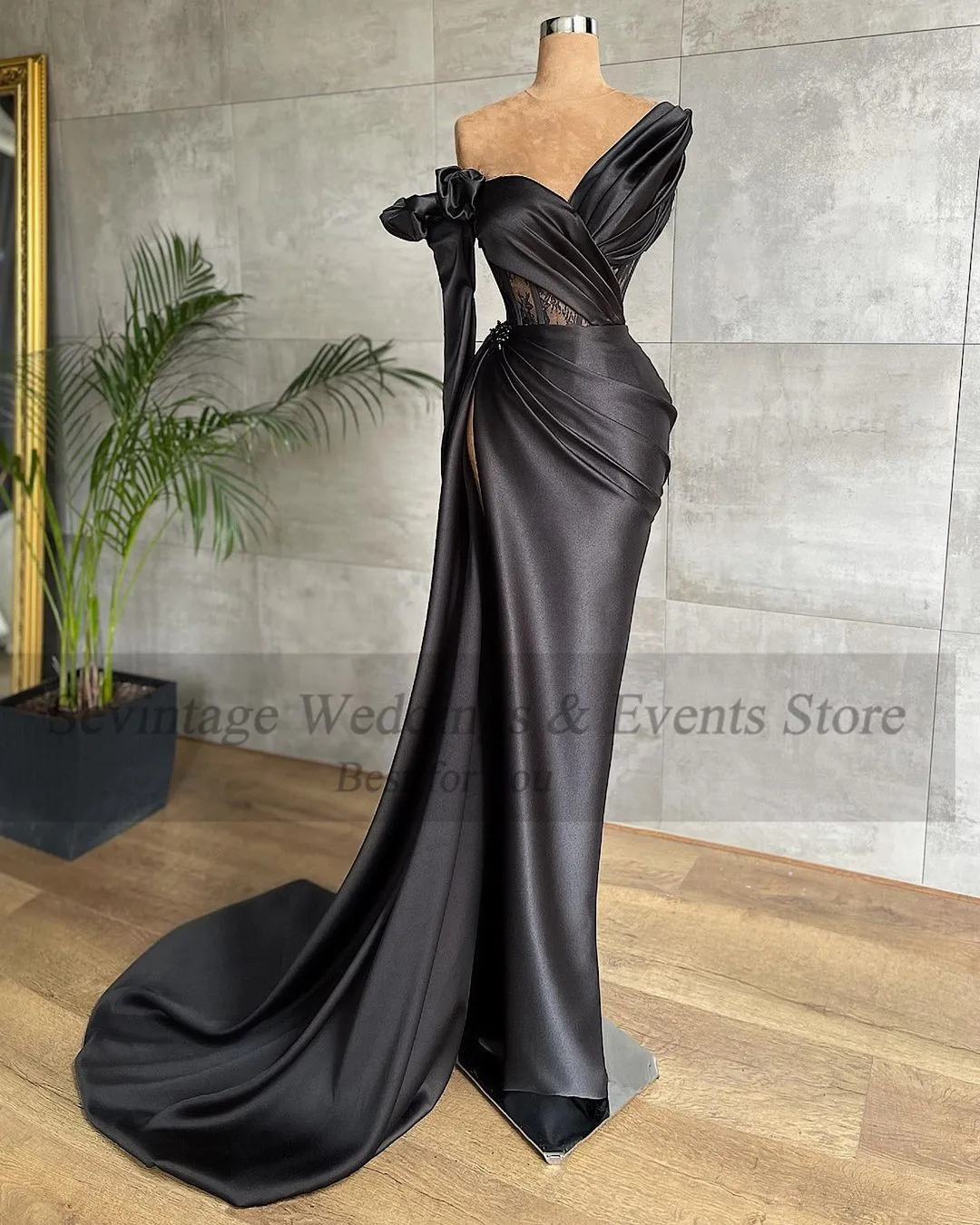 Женское вечернее платье-Русалка Sevintage, черное Плиссированное кружевное платье с длинным рукавом и одним открытым плечом, платье для выпускного вечера и вечеринки, Клубное платье с разрезом