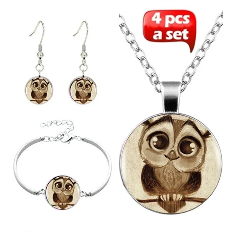 Набор ювелирных изделий с изображением милой совы, кабошон, стеклянный кулон, ожерелье, серьги, браслет, всего 4 шт. для женщин, модные подарки Вечерние