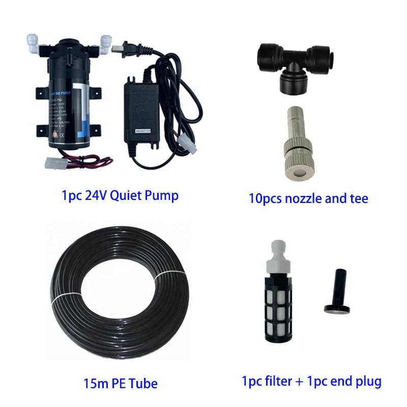 Тихий насос 24 В: 1 шт.Источник питания: 1 шт.Трубка: 15 мРаспылитель: 10 шт.Футболки: 10 шт.Торцевая вилка: 1 шт.Головка впускного фильтра: 1 шт.Резак для труб: 1 шт.40 зажимов для седла40 кабельных стяжек