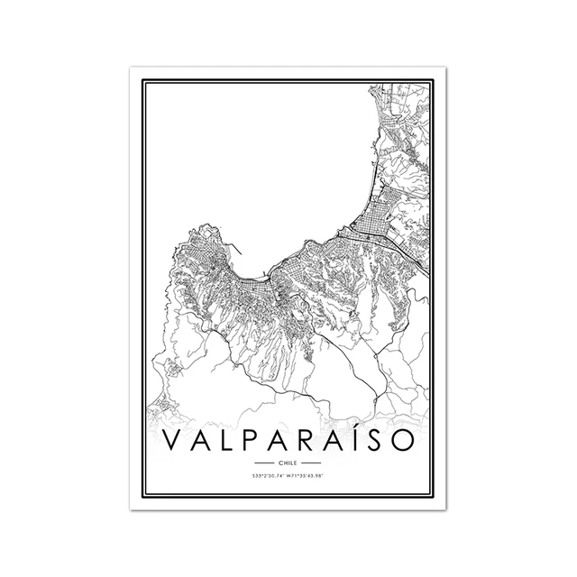 Картина на холсте, настенное искусство, карта Чили, Сантьяго, плакат, черно-белая печать, Карта города валпаризо, картина, украшение для дома и офиса