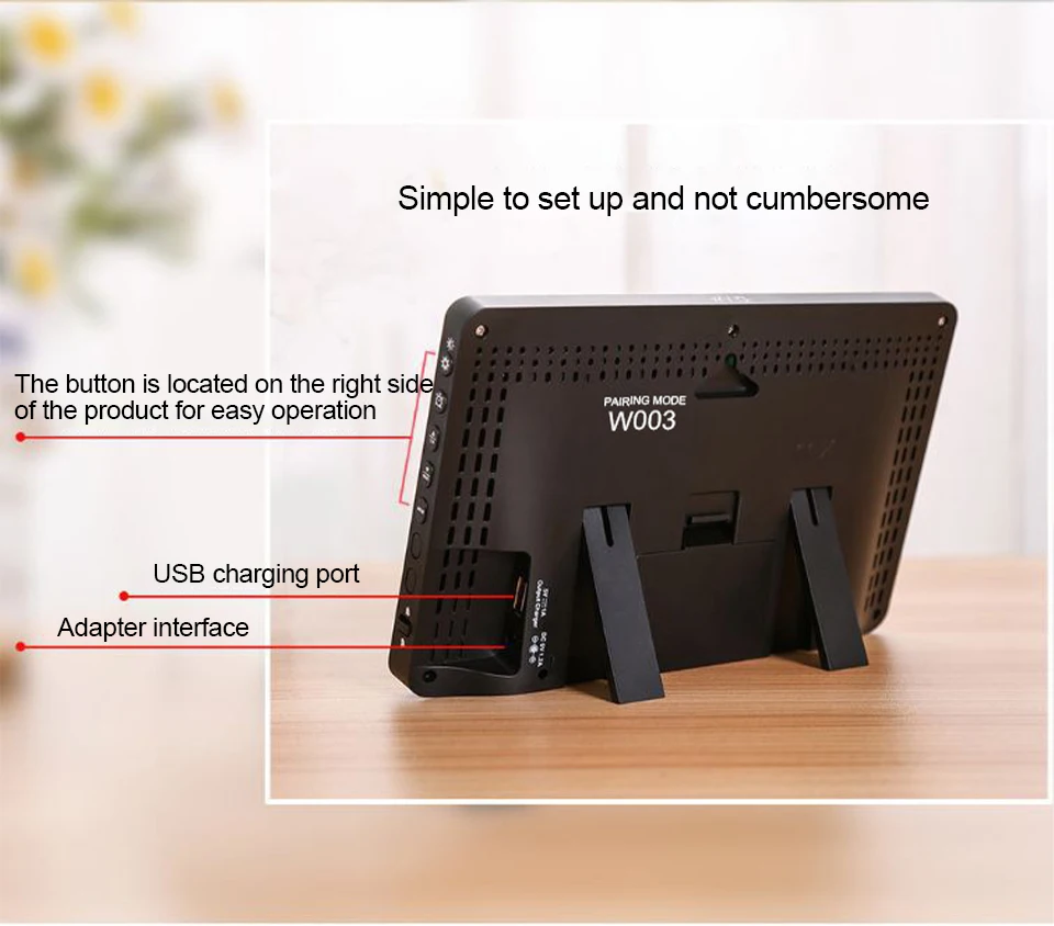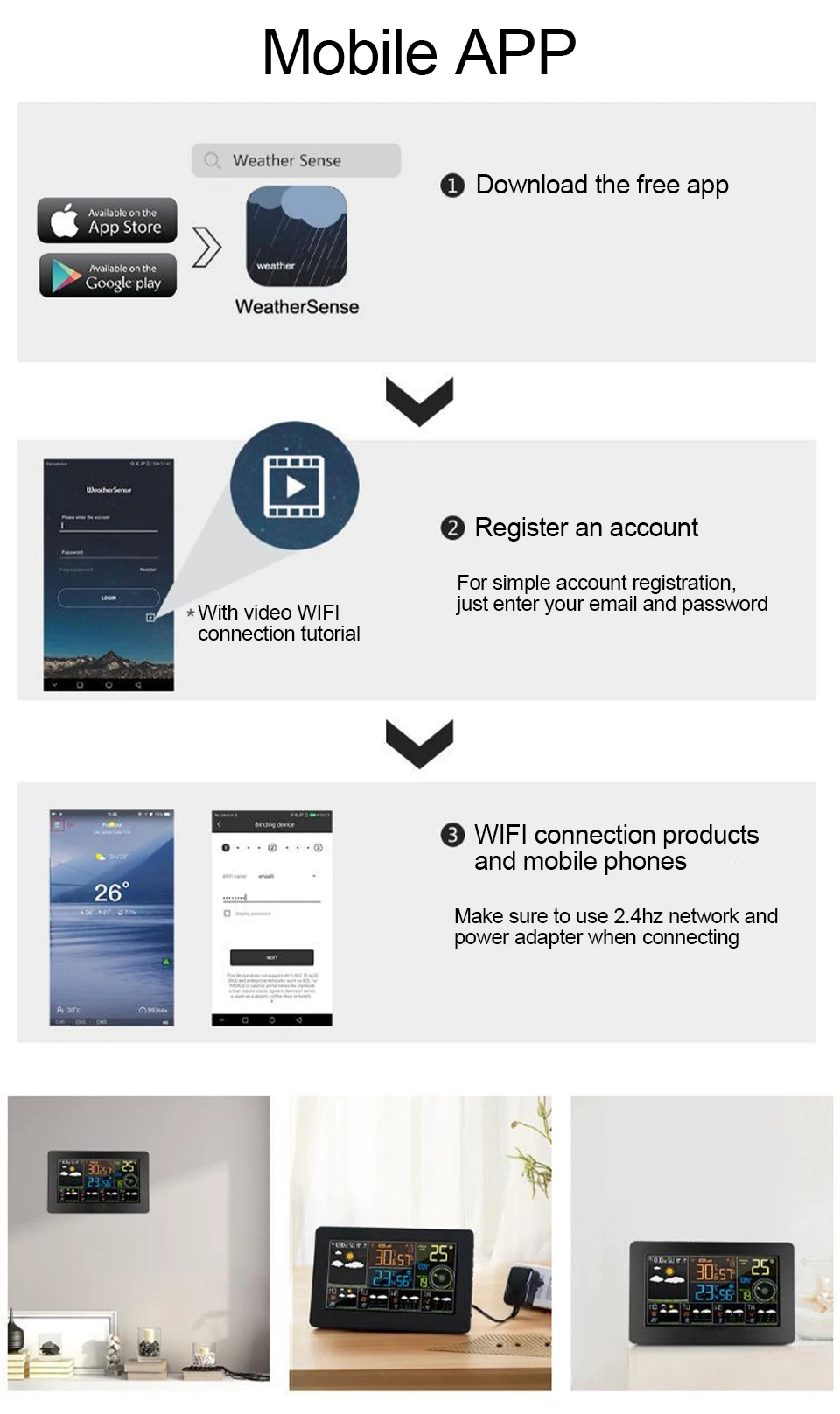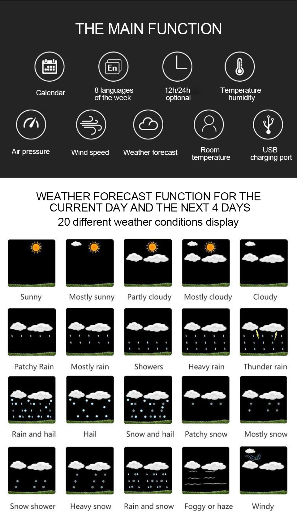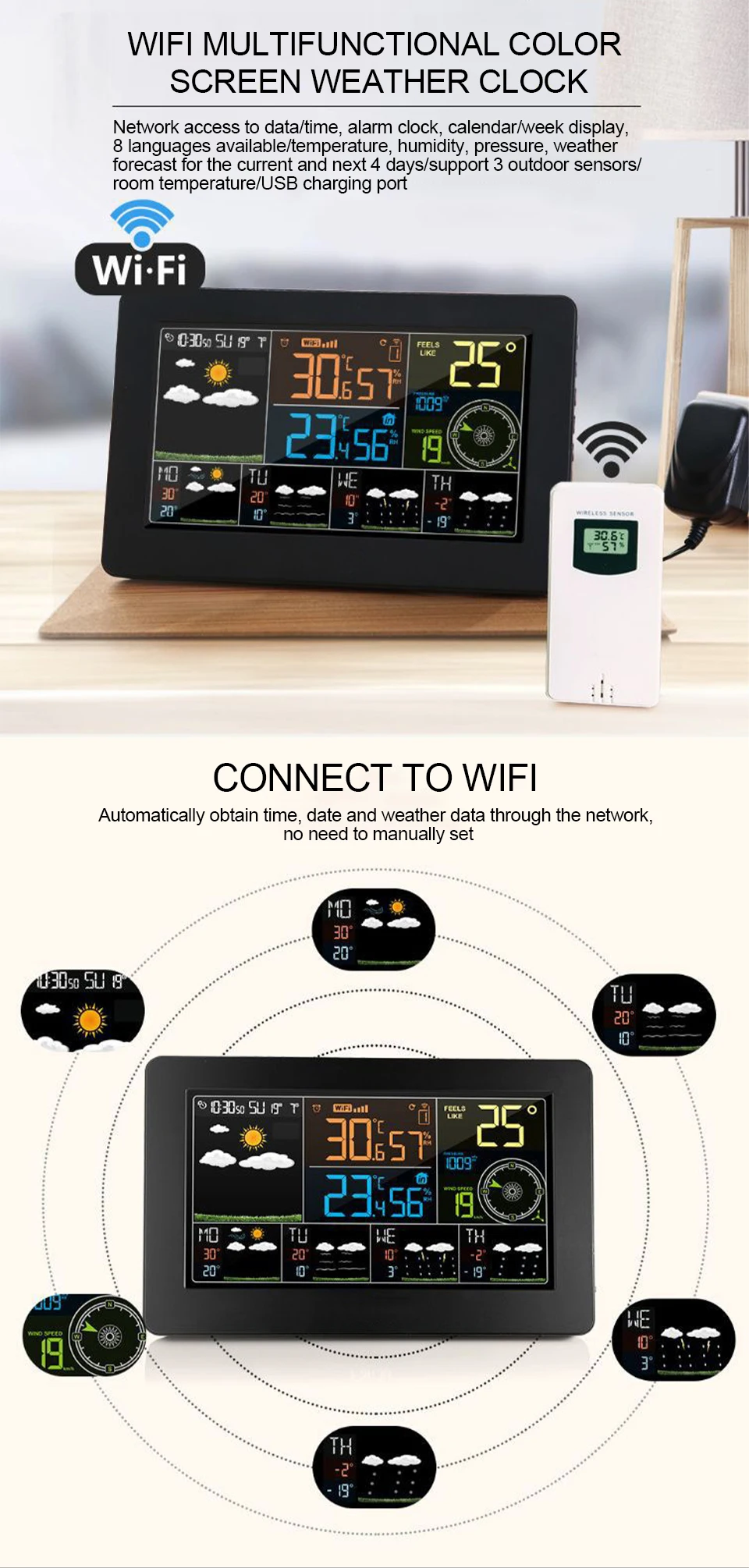 A. Легкое соединение между wather station и вашим смартфоном с установкой видео. Данные собираются из Интернета, более удобные и точные.B. Автоматическая настройка времени и даты из интернета. Время в опциональном формате 12/24 часов. Может быть в качестве будильника с функцией повтора. День недели на 8 языках выбор пользователя: английский, немецкий, итальянский, французский, испанский, голландский, датский и русский.Сегодня и в течение следующих 4 дней прогноза погоды. Может отображать температуру в помещении/на улице и влажность (°C или °F), барометрическое давление, скорость ветра и оповещение о морозе.C. Скорость ветра в качестве альтернативы в км/ч или миль/ч. Минимальный/максимальный дисплей для влажности воздуха и температуры. Трендовое отображение давления воздуха, температуры и влажности.D.4 уровней яркости Подсветки Выберите с адаптером питания. Подсветка поддерживает только освещение с адаптером питания. Если Погодная станция работает только с батареей, задний светильник активен только в течение 15 секунд, нажмите кнопку «светильник», это может немного трудно увидеть дисплей без задний светильник.E. До 3 удаленных датчиков подключения, обжарки дисплей 3 номер данных о погоде. (В комплект входит только 1 датчик). 60 метров дальность передачи на открытой местности.Usb-порт для зарядки электронных устройств.