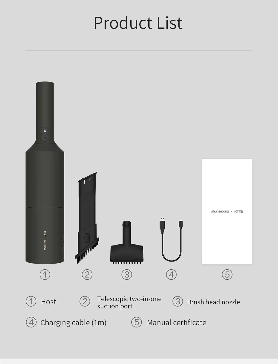 Основные характеристики【Доступно для автомобильного аккумулятора 】Поддержка зарядки 5 В/2 А или 9 В/2 а типа C, может заряжаться через автомобильный прикуриватель.【Крошечный и большой сукциона】Большой, как для винных бутылок, может быть с легкостью помещается в автомобиль, диск объемом до 60000 об./мин., при этом максимальная 7000Pa всасывающую силу.【Низкий noise】За счет использования сейсмической дизайн, мотор способен работать в низким уровнем шума хоть до 60000 об./мин..【Профессиональная насадка для различных салфеток 】Вертикальное сопло: подходит для большинства ситуаций, защищает ткань во время работы, более мощный, чем Горизонтальное соплоТелескопическое сопло: подходит для узкого места, клавиатуры, кондиционера и т. Д.Широкая форсунка: подходит для стола, кровати, подушки и т. д.【 Двухслойная фильтрационная системаЭффективно фильтрует пыль и предотвращает вторичное загрязнение, можно мыть повторно (не длительное погружение)【Беспроводной и портативный 】Беспроводной портативный, более гибкий, не только для дома, но и для офиса и автомобиля.【Легко моется, перерабатывается 】Легко видеть вдыхаемую пыль через прозрачный сбор пыли, съемный, моющийся и перерабатываемый.Спецификация продуктаНазвание: Z1 pro (большая версия всасывания); Z1 (стандартная версия)Модель: Z1 Pro; Z1Цвет: черный; БелыйРазмер: 73*76*336 ммОбъем стакана пыли: 100 млВходная мощность: 120 Вт/40 Вт; 90 ВтМаксимальная степень вакуума: 15500pa; 7000paРежим зарядки:DC5V2A/DC9V2ATypeC;DC5V2A/DC9V2ATypeCВремя зарядки:DC5V2A3h, DC9V2A2hВремя разряда: высокий 10 мин/Низкий 30 мин, 12 минШум: 78dba (Уровень звукового давления 66,5 дБ) для высококлассных и 70dba (Уровень звукового давления 58,5 дБ) для низкоклассных;Уровень скорости обновления 78dba (Уровень звукового давления 66,5 дБ)Переключатель освещения: ДаЛогика переключения: Низкий/Высокий/выкл; ВКЛ/ВЫКЛСодержимое посылка1 х беспроводной многоцелевой пылесос Shunzao1 хост1 x телескопическая насадка «Два в одном»1 насадка для головки щетки1 x зарядный Lin (1 м)1 x сертификат спецификации