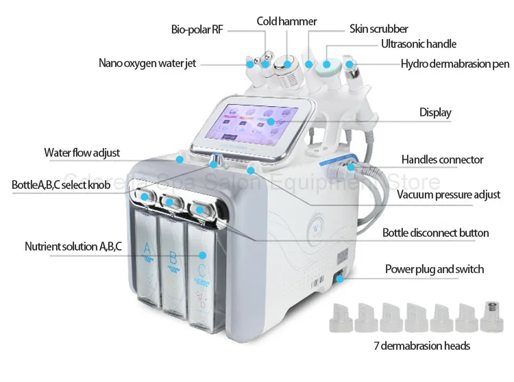 Мульти-Полар-флисаМульти-Полярный обеспечивает тепловую энергию в подкожной клетчатке, чтобы способствовать сужению подкожного коллагена при охлаждении поверхности кожи.Гидро-дермабразияМикродермабразия-это Неинвазивная процедура по уходу за кожей, которая во время отшелушивания кожи Способствует производству новых клеток и стимулирует рост коллагена, чтобы улучшить тонус кожи и внешний вид.Холодный молотокМолоток для колки льда может уменьшить кровеносные сосуды, эффективно уменьшить варикозное расширение вен, внутривенные вредные вещества легче очистить, разбавить пятна имеют значительный эффект.Нано кислородная струя водыОн не только может полностью удалить глубокие загрязнения пор, так что 99% молекул чистого кислорода максимизируют роль стерилизации, такие как Анаэробные акне и другие вредные бактерии.УльтразвуковойMillon вибрации в секунду ультразвук, когда волна переносится в организацию во главе генерируется вибрацией, может облегчить разрыв жира и помочь предотвратить ожирение.Скруббер для кожиВибрирует 25000-30000 раз в секунду. Глубокое очищение, массаж, избавьтесь от старения. Способствует циркуляции и метаболизму. Повышает способность клеток к переработке кожи и дышать. Не повреждает и не оказывает побочного эффекта на кожу. Работа простая и удобная.