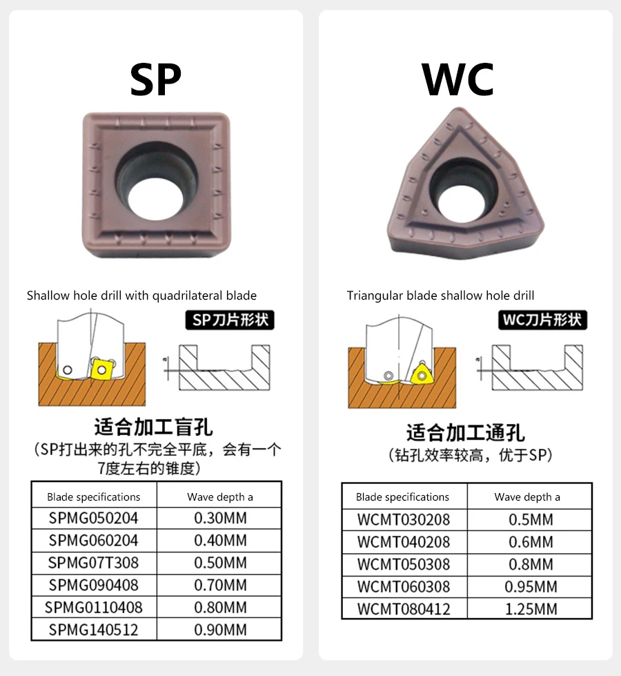 WC U Drill:WC вставка дешевая и имеет высокую эффективность бурения. Вставка персикового типа и может использоваться с трех сторон. Эффективность бурения немного лучше, чем у SP типа.SP U Сверло: нижнее отверстие SP вставки плоское по сравнению с WC, но не полностью плоское. SP вставка квадратная и может использовать 4 режущие поверхности, с лучшей отделкой, чем туалет.