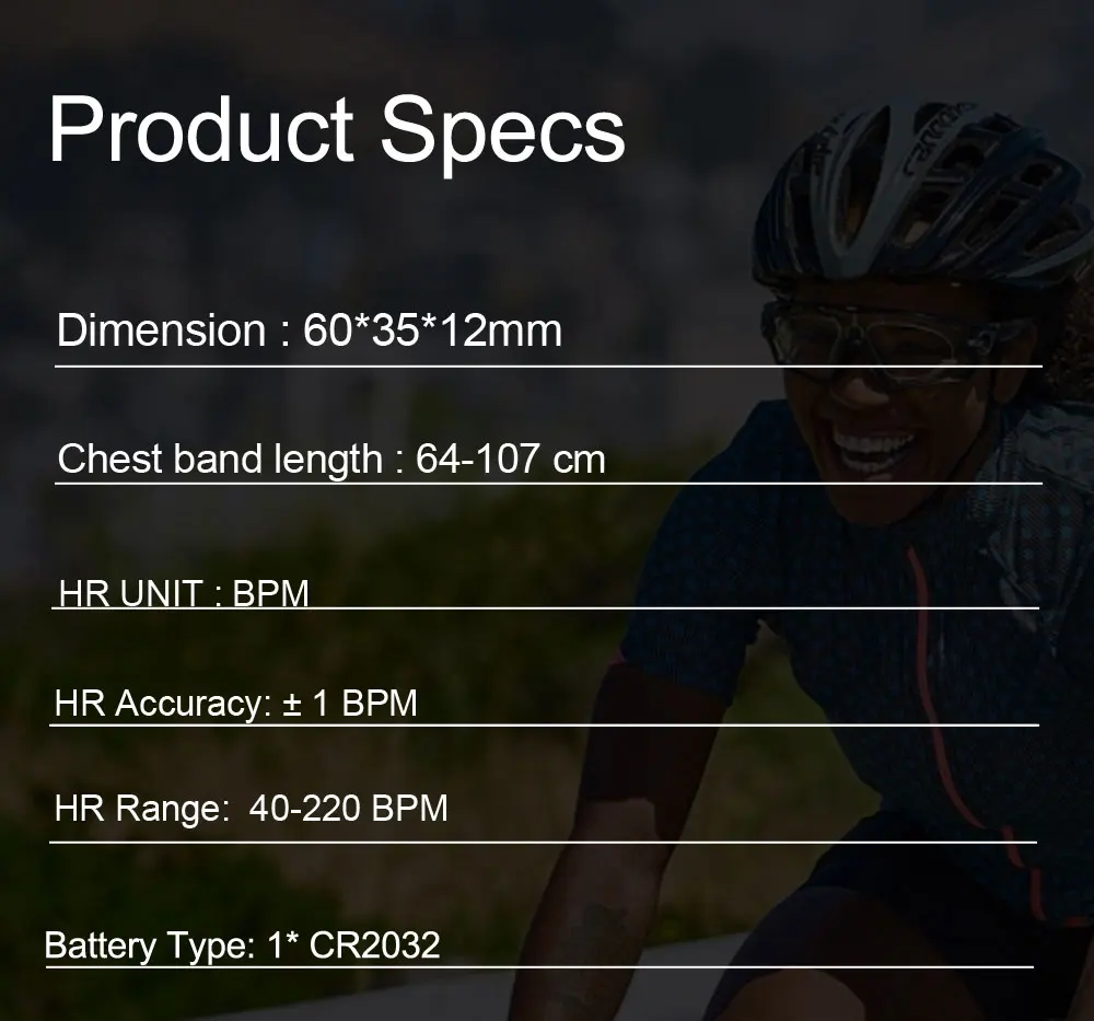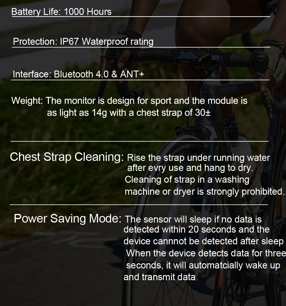 Новый монитор сердечного ритма для точного отслеживания частоты сердечных сокращений, частоты сердечных сокращений и сожженных калорий во время тренировок. Подключается к устройствам ANT + и Bluetooth 4,0 для предоставления данных в ваших любимых фитнес-приложениях.Монитор сердечного ритма изготовлен из долговечных износостойких материалов, которые не сломаются, не трескаются или не рвутся. Водонепроницаемость IP67 означает, что вы можете использовать этот датчик сердечного ритма в дождь, но не для плавания.1. Длительный срок службы батареи, сменный аккумулятор хватает на1000 h использования.2. Поддержка ANT + и Bluetooth 4,03. Совместимость с garmin , igpsport, ZWIFT , WAHOO , STRAVA и так далее