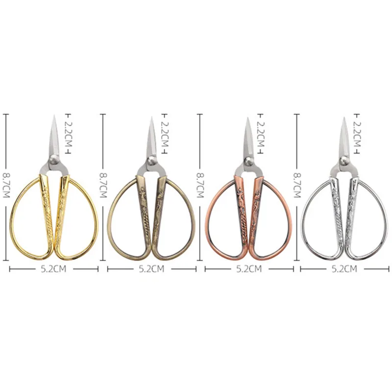 Материал ручки: цинковый сплавМатериал лезвия: нержавеющая стальЦвет: золото, серебро, бронза, красная медьРазмер: 8,7*5,2 смПосылка включает в себя: ножницы 1 шт.