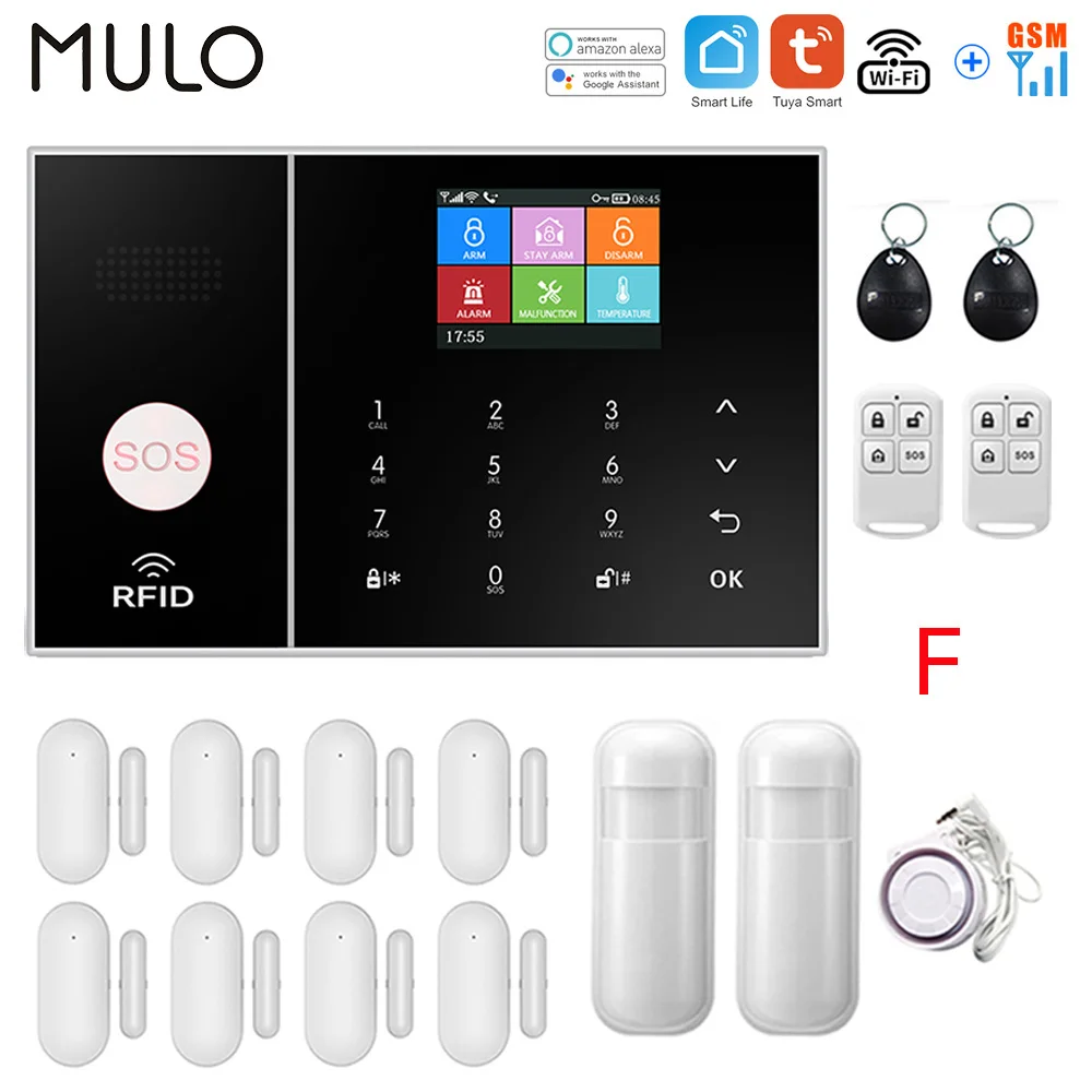 Комплект N: 1 панель сигнализации + 1 датчик движения PIR + 1 датчик двери + 2 пульта дистанционного управления + 2 RFID бирки + 1 проводная сирена + 1 кнопка SOS + 1 детектор дыма.